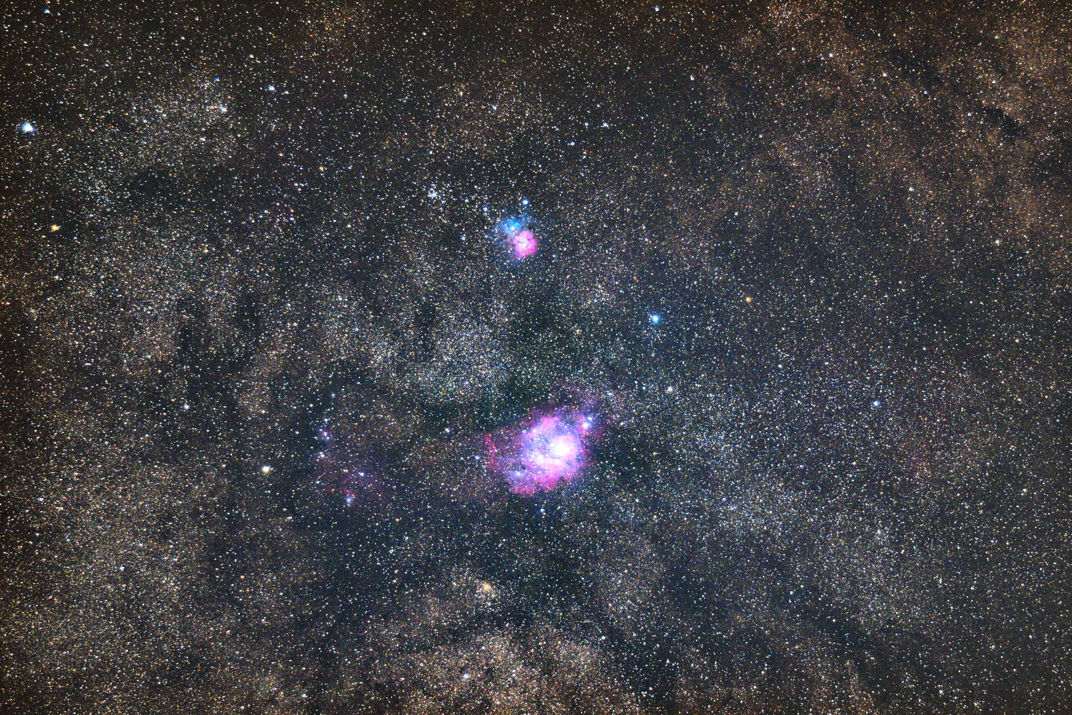 夏の定番の干潟星雲M8と三裂星雲M20です。中央が白飛びしないように、今回は露出を抑えて撮ってみました。透明感が出せたかも…。30枚を加算平均しています。