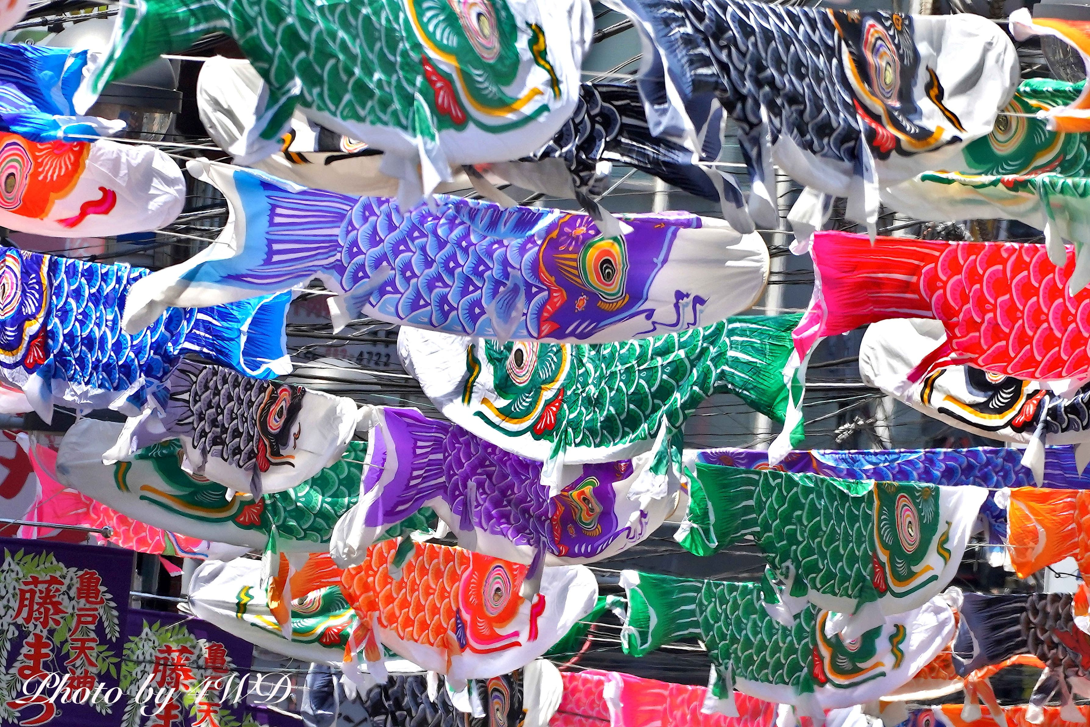 亀戸の商店街に飾られている鯉のぼり 全画素超解像ズーム機能使用