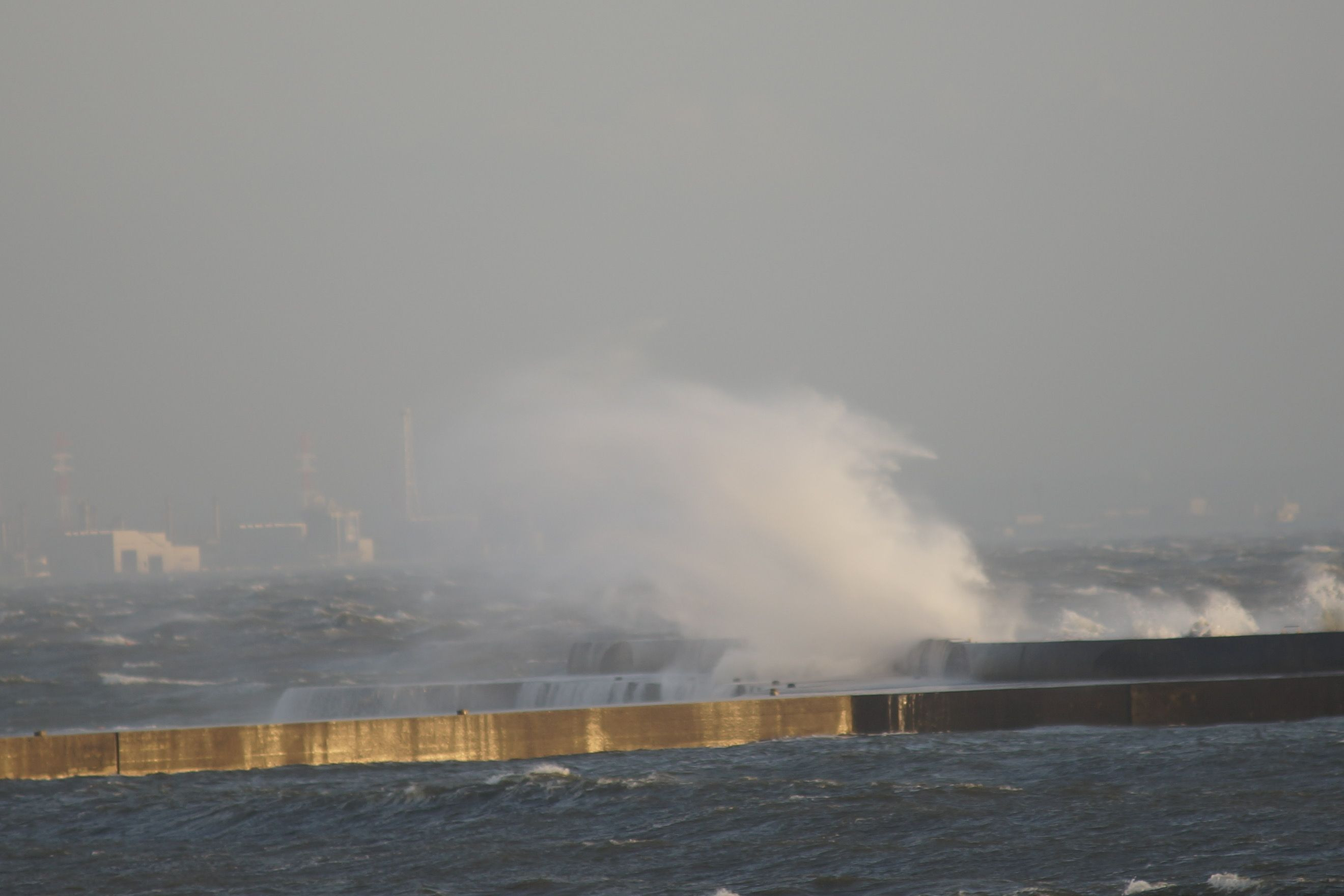 連休の後半、突風吹きまくり海は大荒れ 堤防に砕け散る波が飛沫となって塩気を運ぶ 自然とは凄いものだ