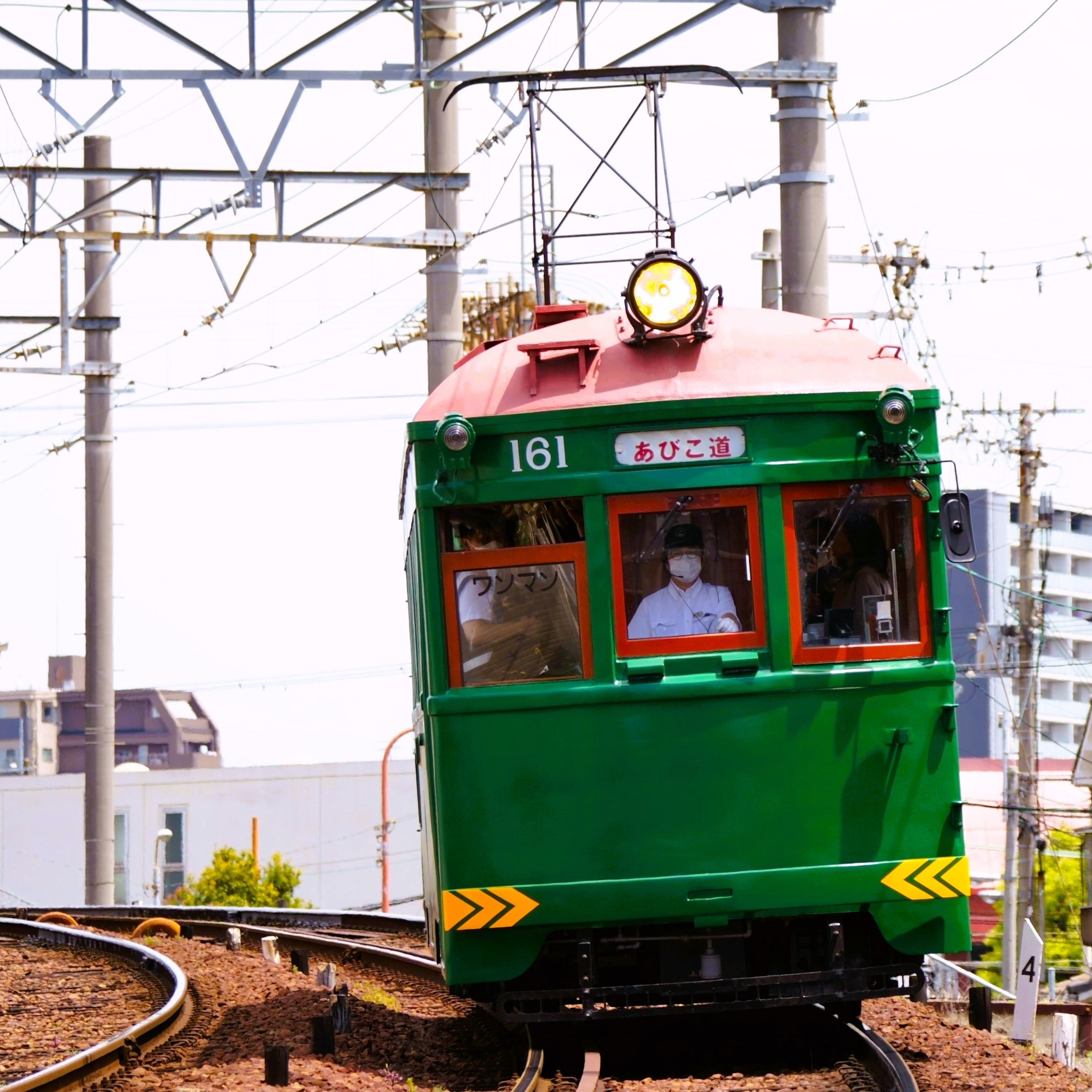 モ161形の代表のモ161号車はレストアされて濃緑色の大型車体に錆止めの赤い屋根と大型パンタグラフと独立したヘッドランプが目を引きます 上町線と阪堺線の分岐点を右折するモ161号車 住吉~神ノ木