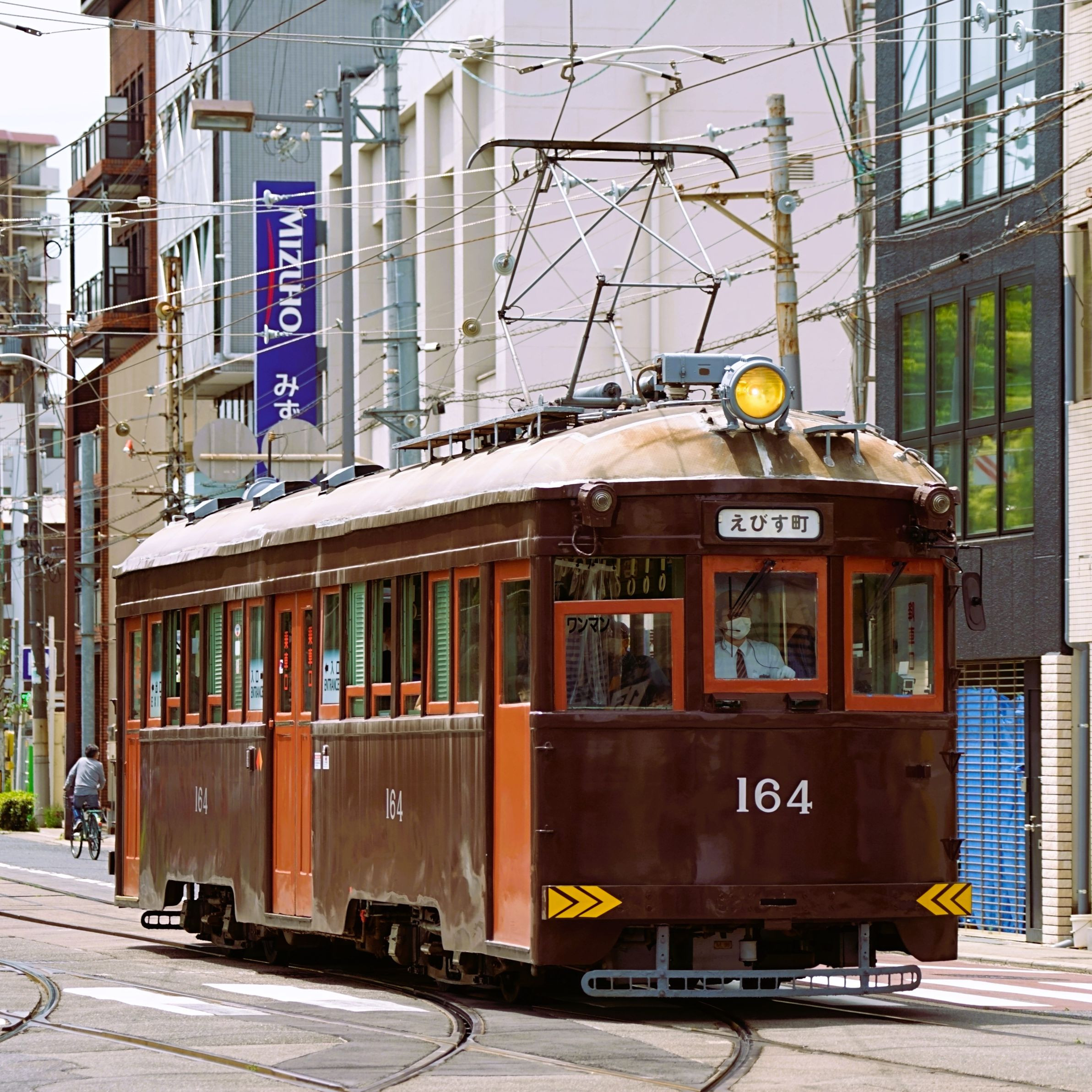 モ161形モ164号車は導入当時のこげ茶色に復元塗装されたショックなチンデン 阪堺線 住吉~東粉浜