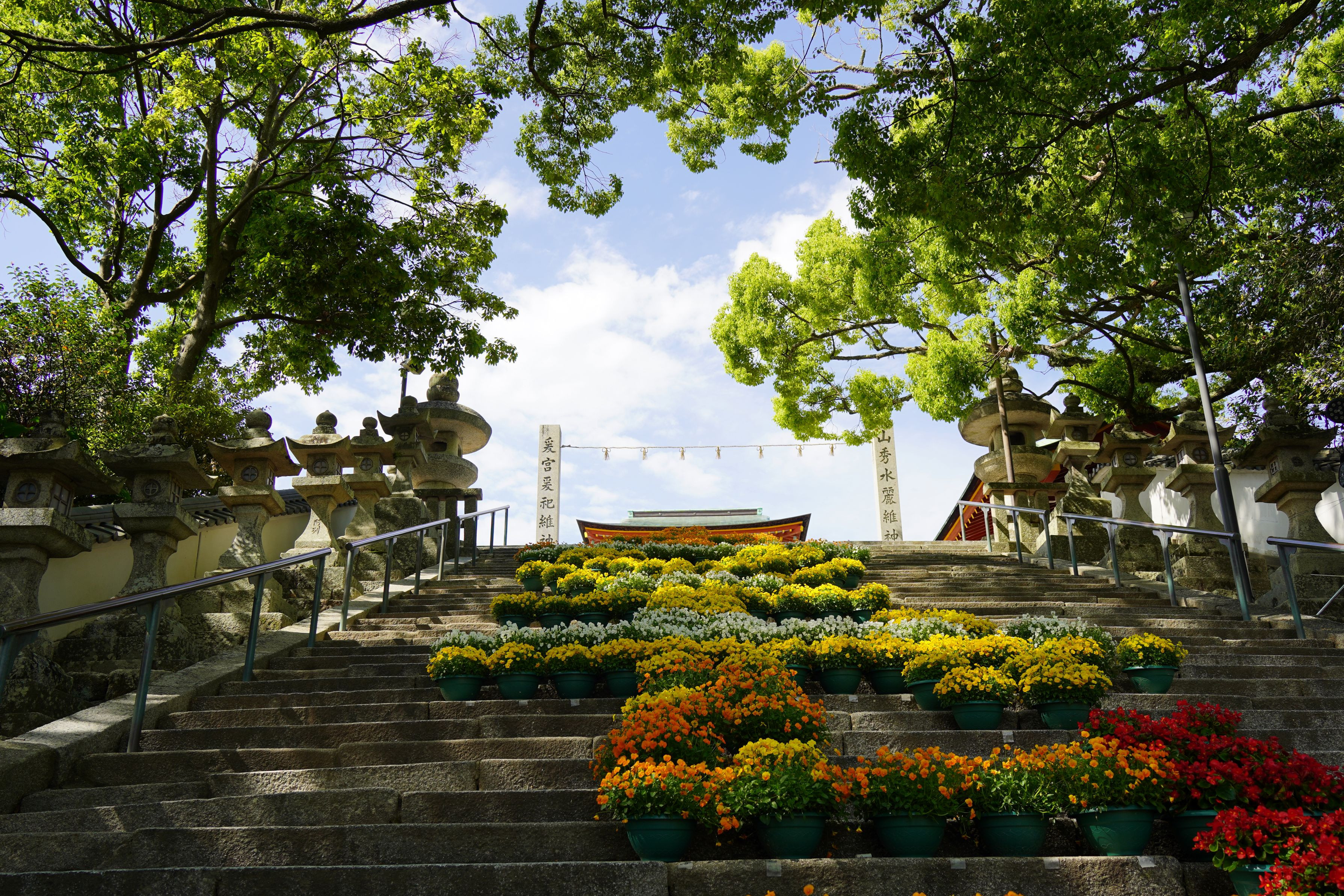爽やかな風に背中を押されて、花で彩られた階段を進んで参拝しました。 気持ちの良い5月です。