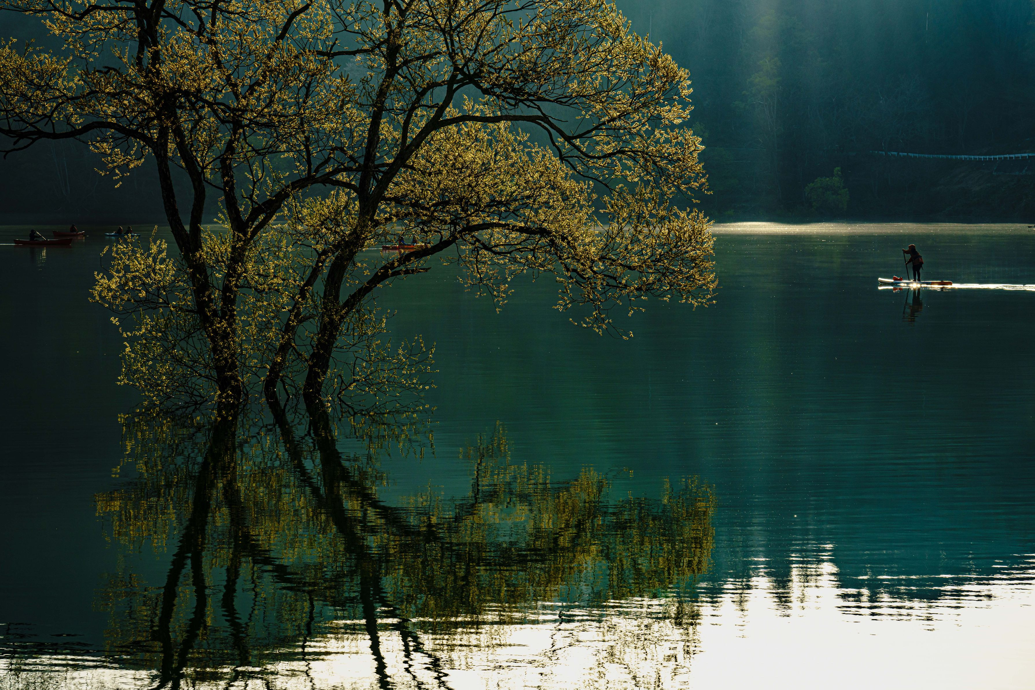 眩しい朝陽が湖に入ってきました 白川湖