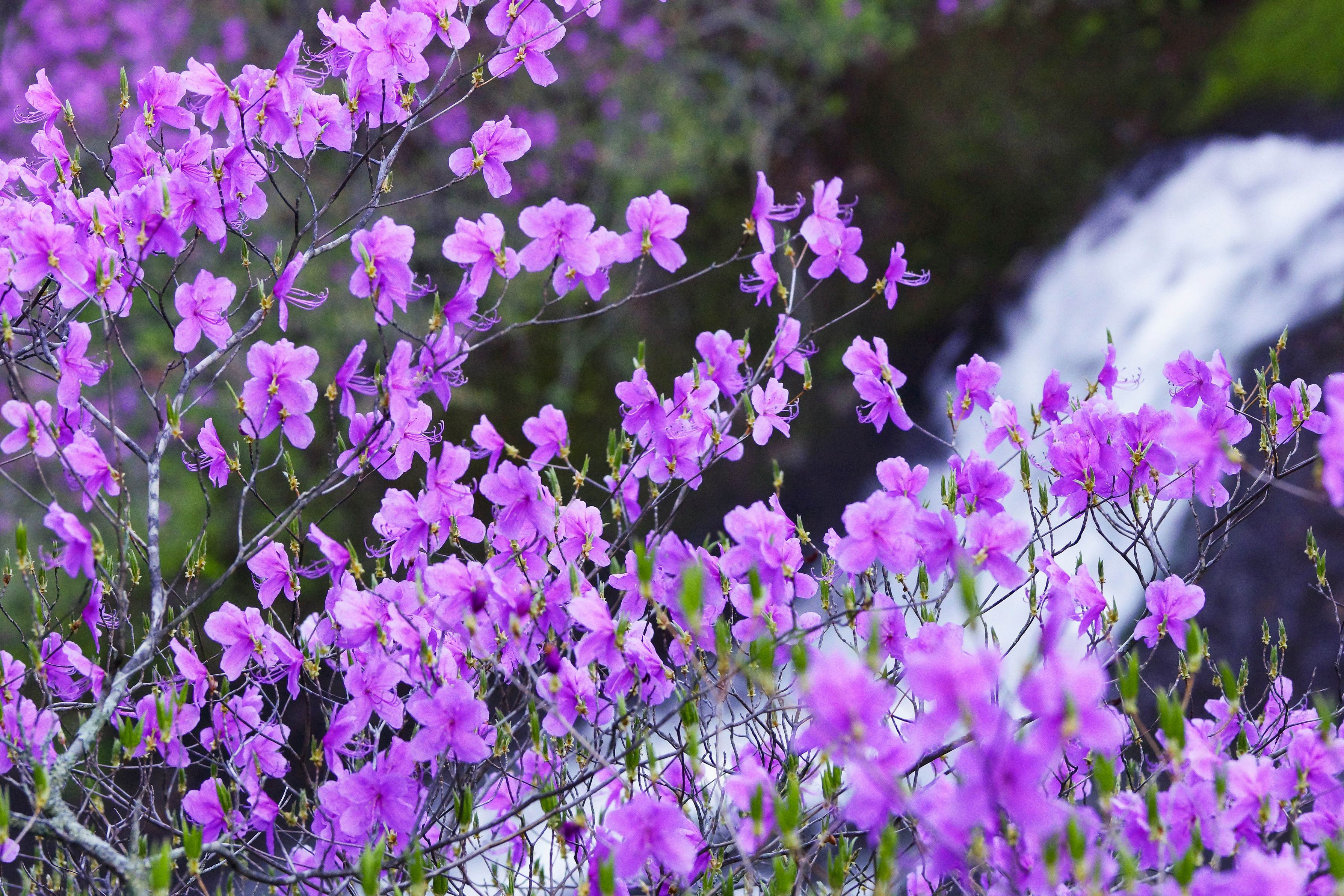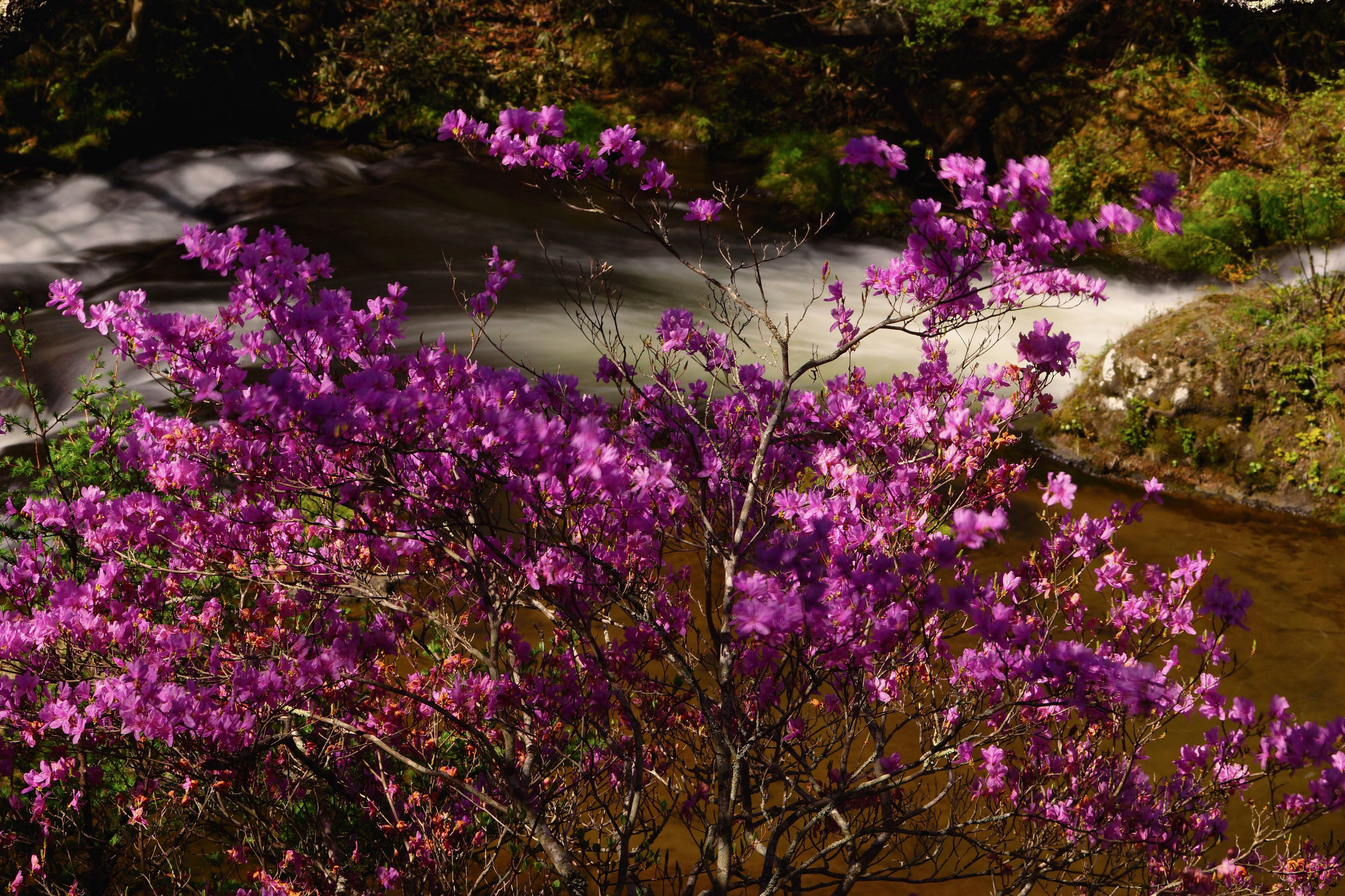 渓谷に咲き誇る トウゴク三つ葉ツツジが初夏の香りを漂わせていた 背景に清流を配置したフレーミング3枚で