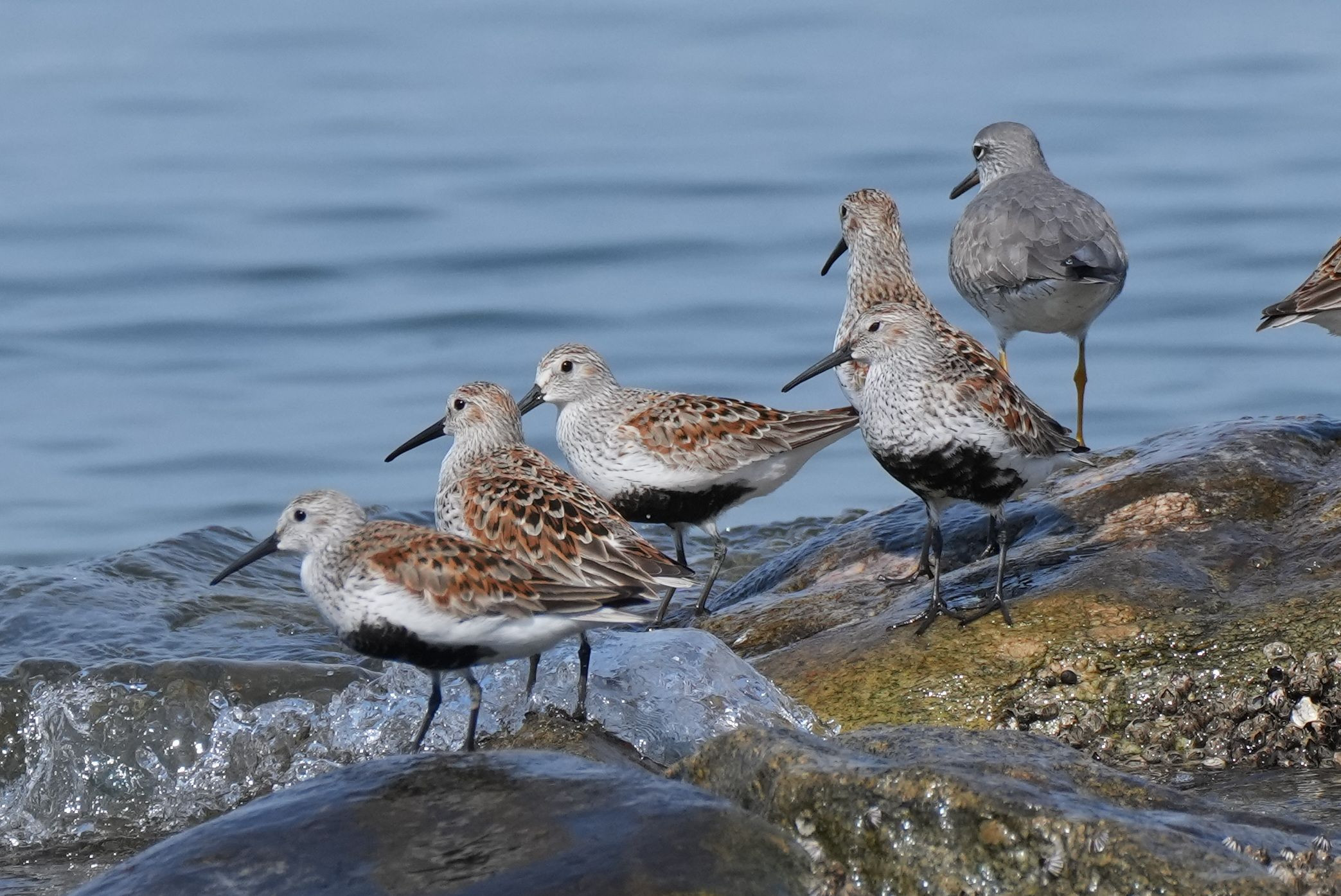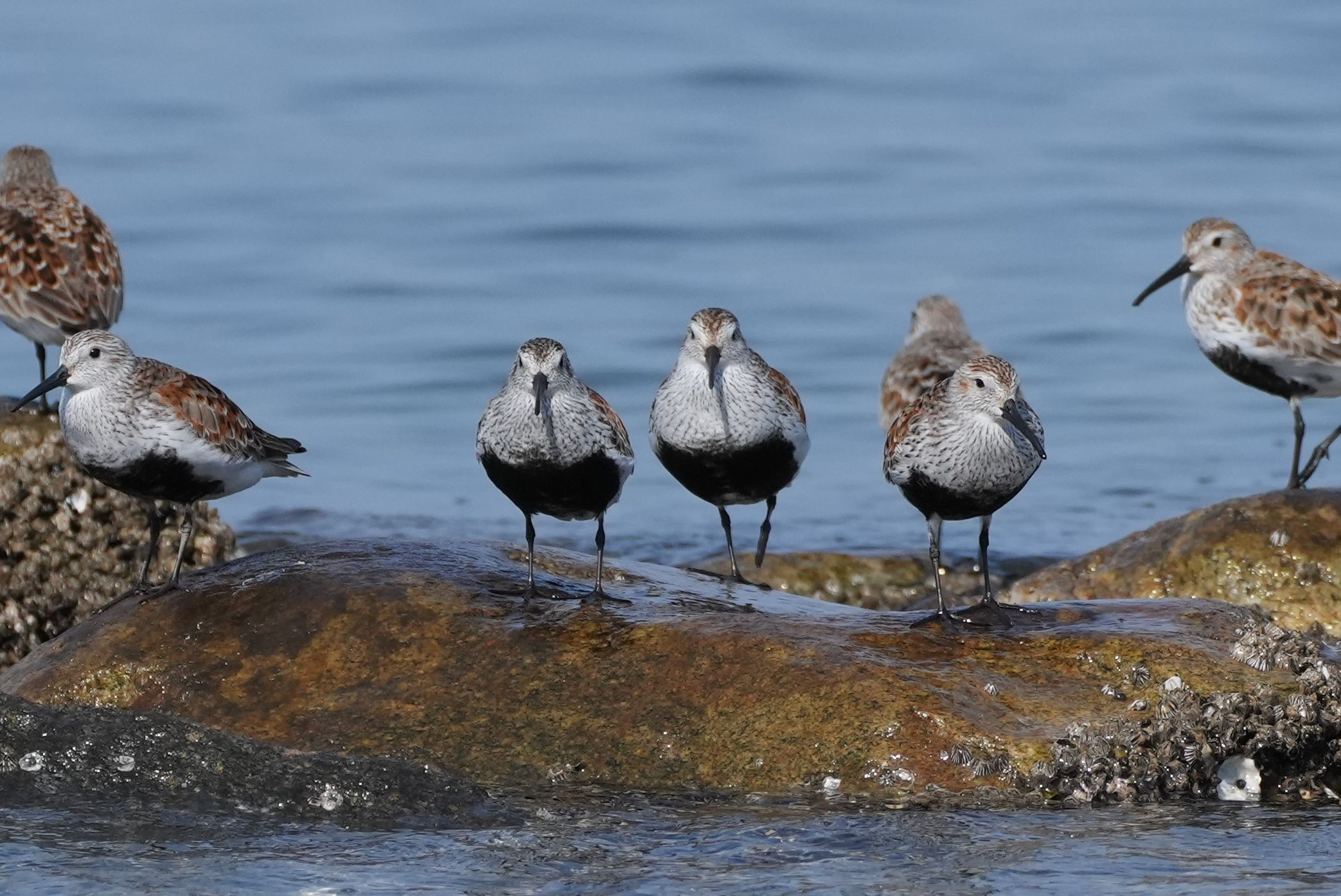 ハマシギが珍しく磯で静かに休憩していたが、なかなか同じ方向を向いてくれない。何とかそろったのがこの2枚。