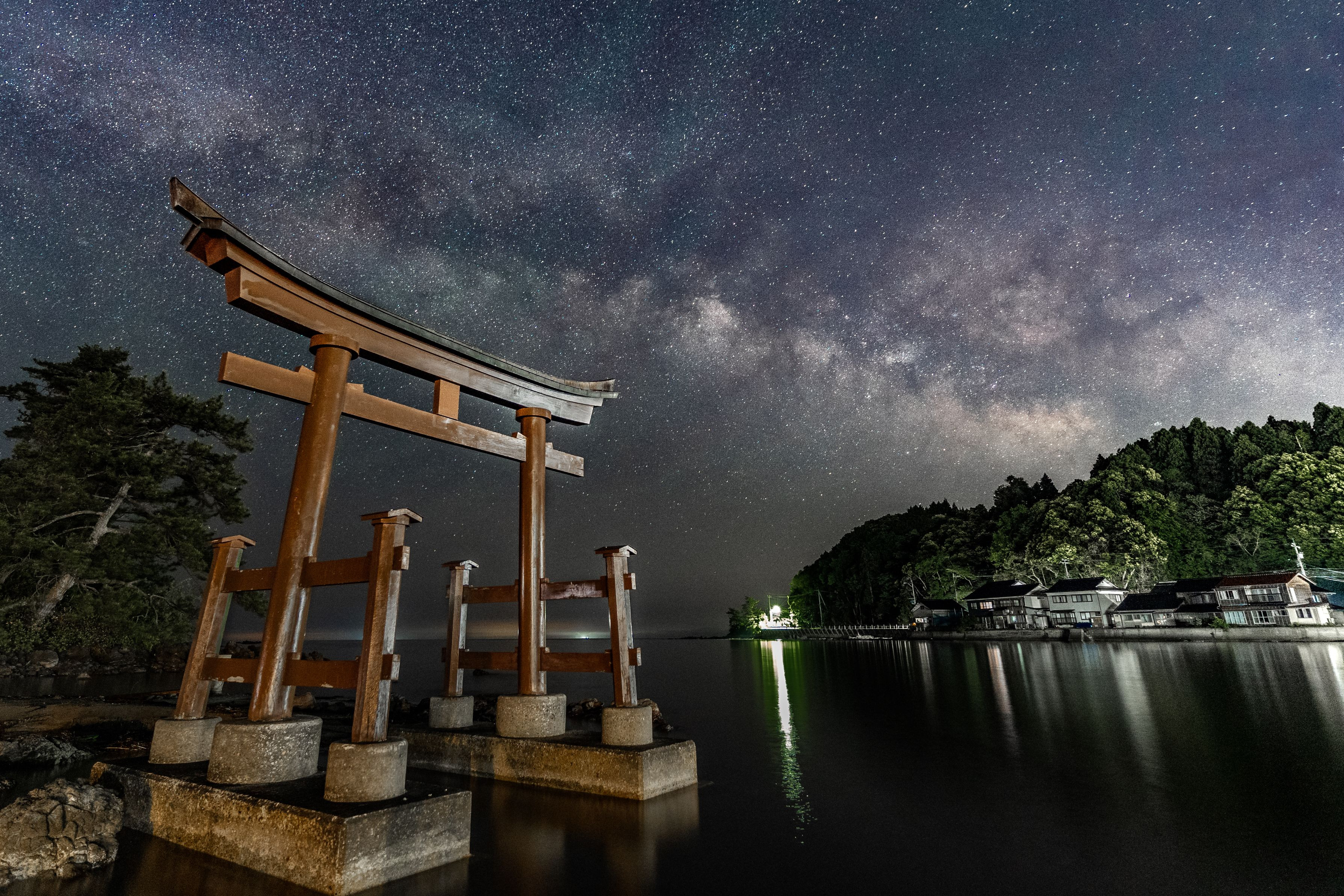 海の中にある鳥居の上空に春の天の川がかかりました。