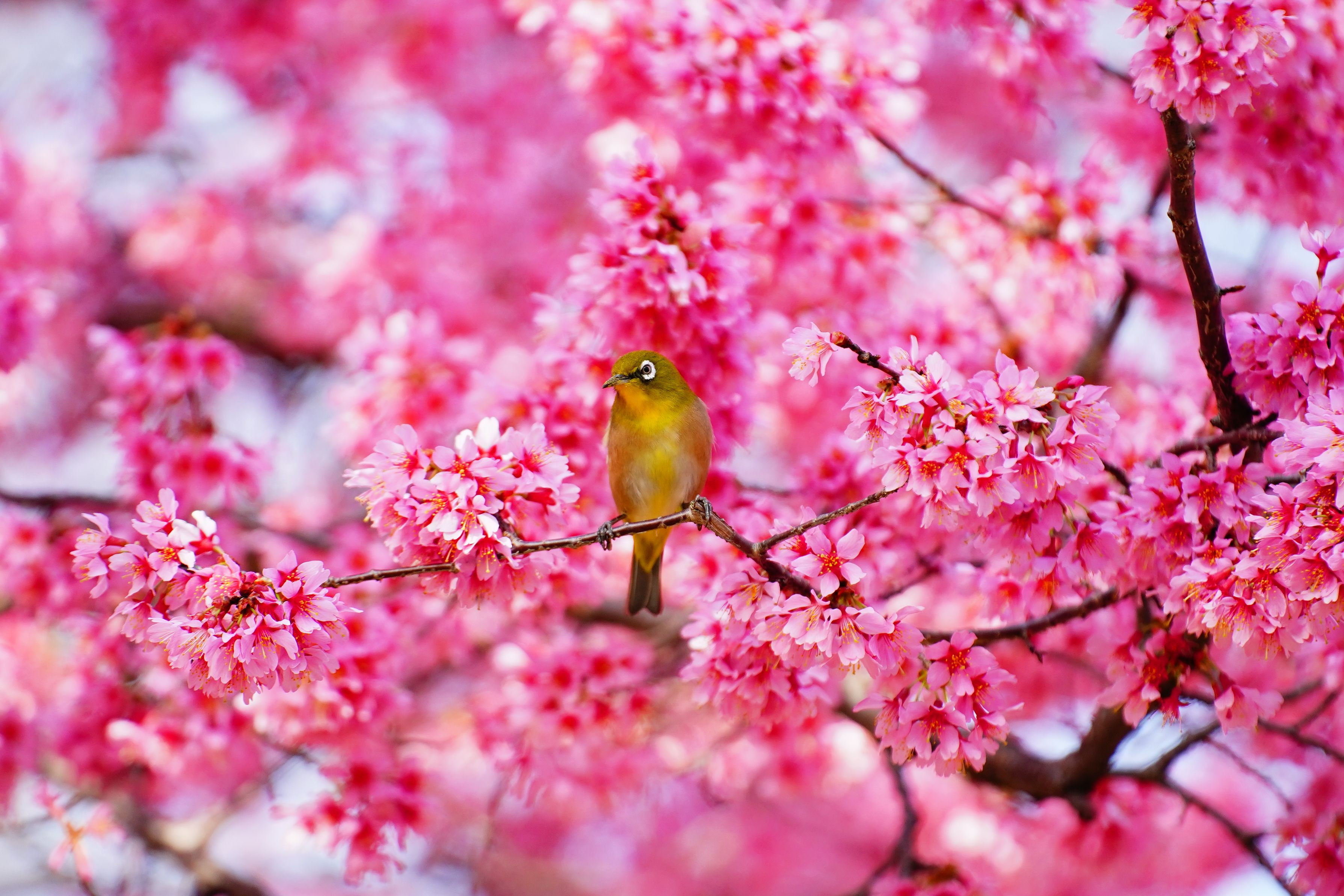 満開のさくらとメジロ