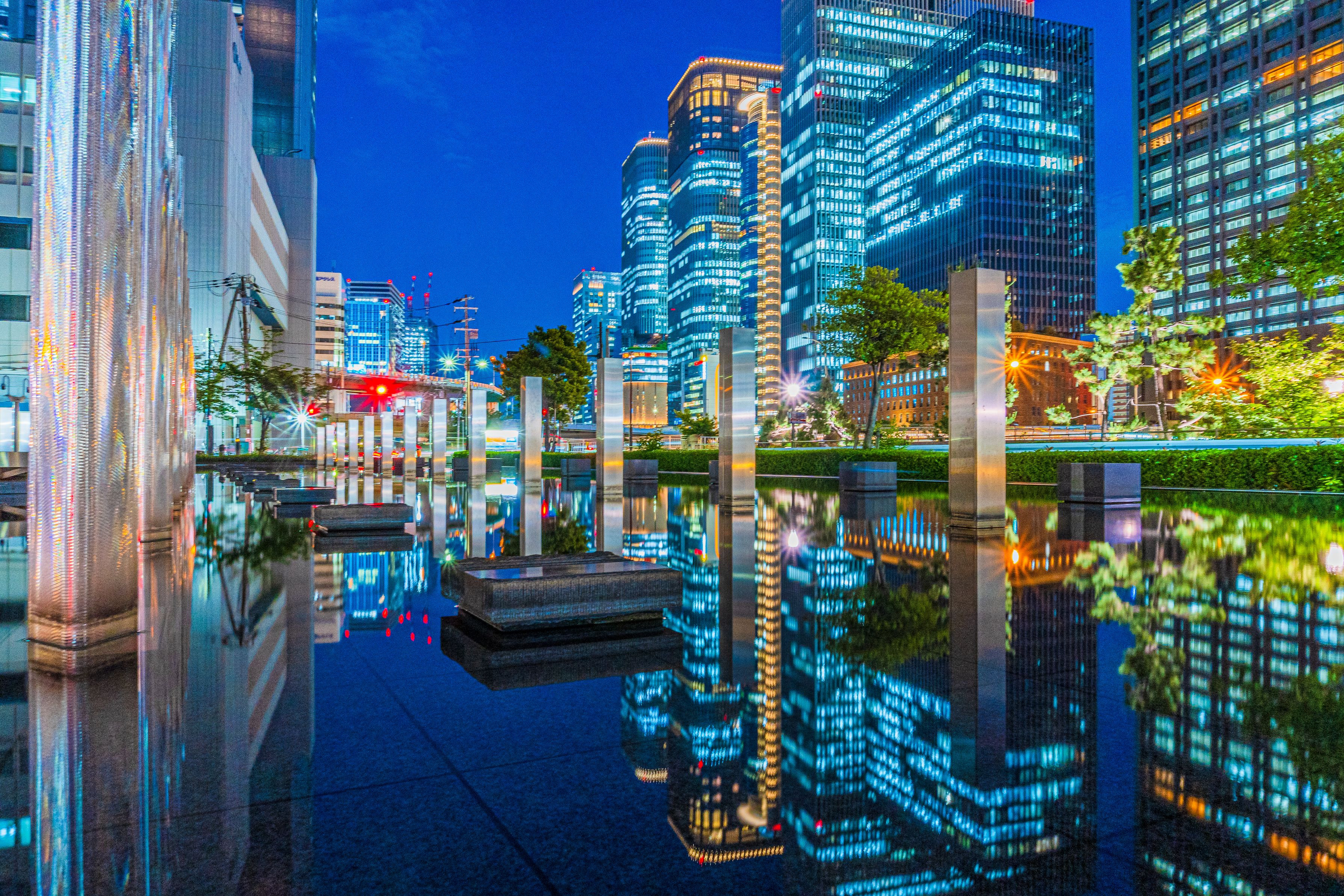 仕事の帰り道に見つけた場所です。中之島の高層ビルがリフレクションします。