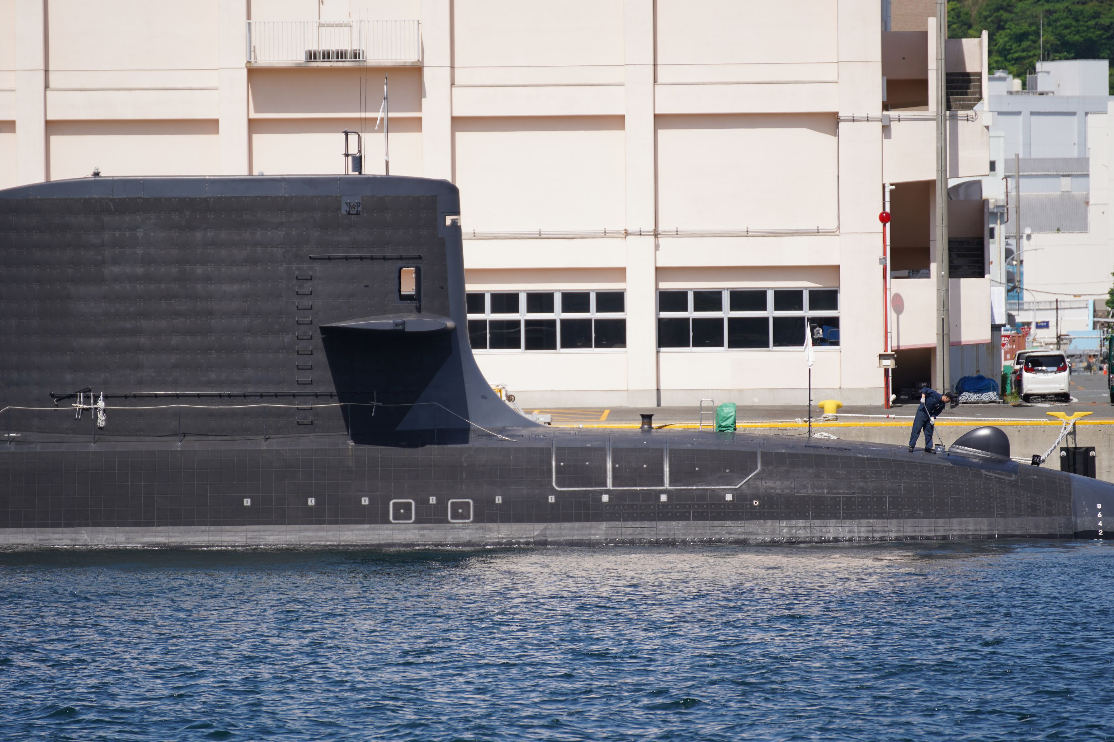 横須賀の公園から見えた、たいげい型潜水艦。乗組員の方がお掃除していらっしゃったのでシャッターを押しました。ご苦労様です。