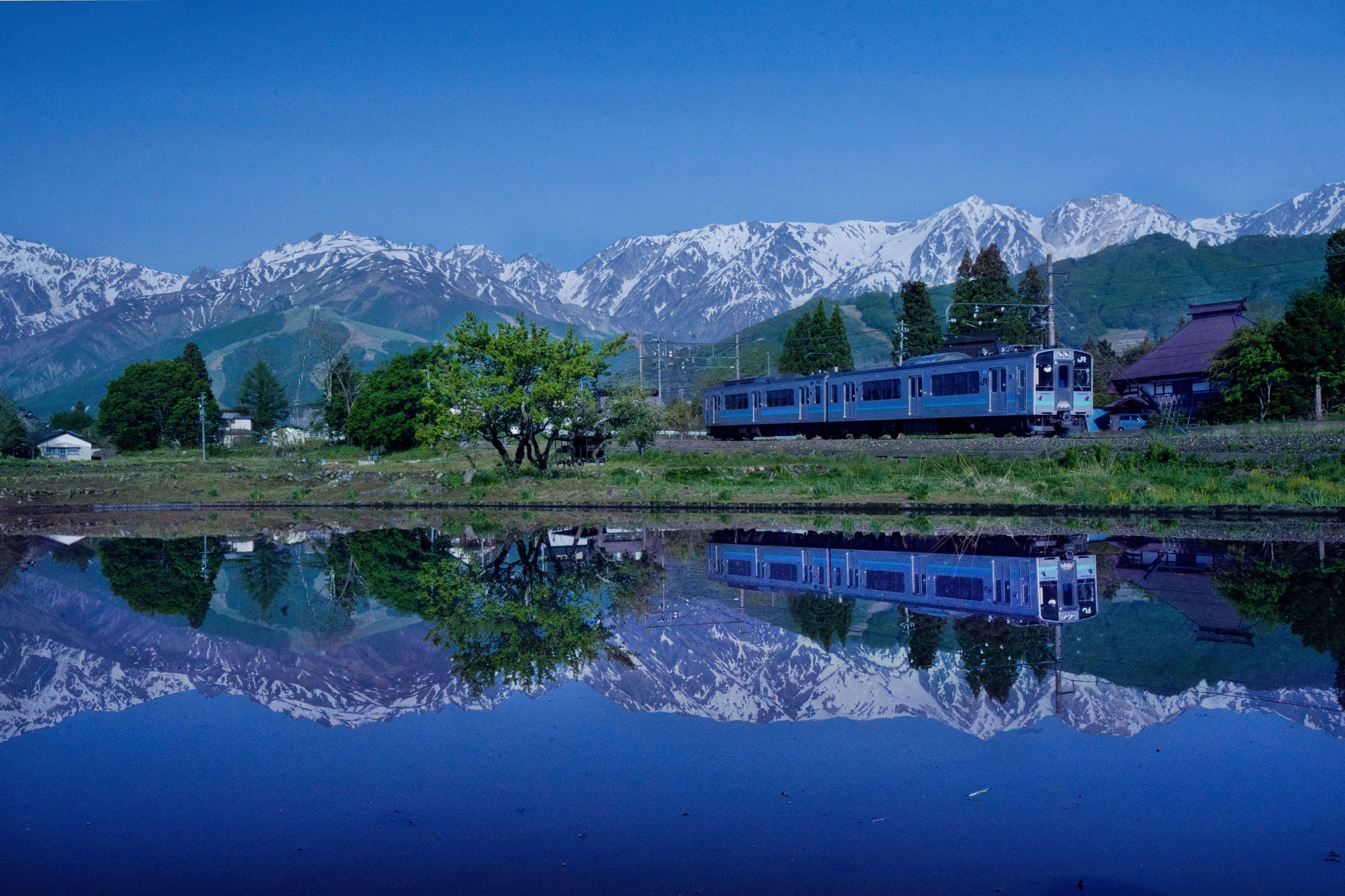 風がピタリとやんだその時「ガタンゴトン~ガタンゴトン~」と電車が走り抜けていきました。 #大糸線