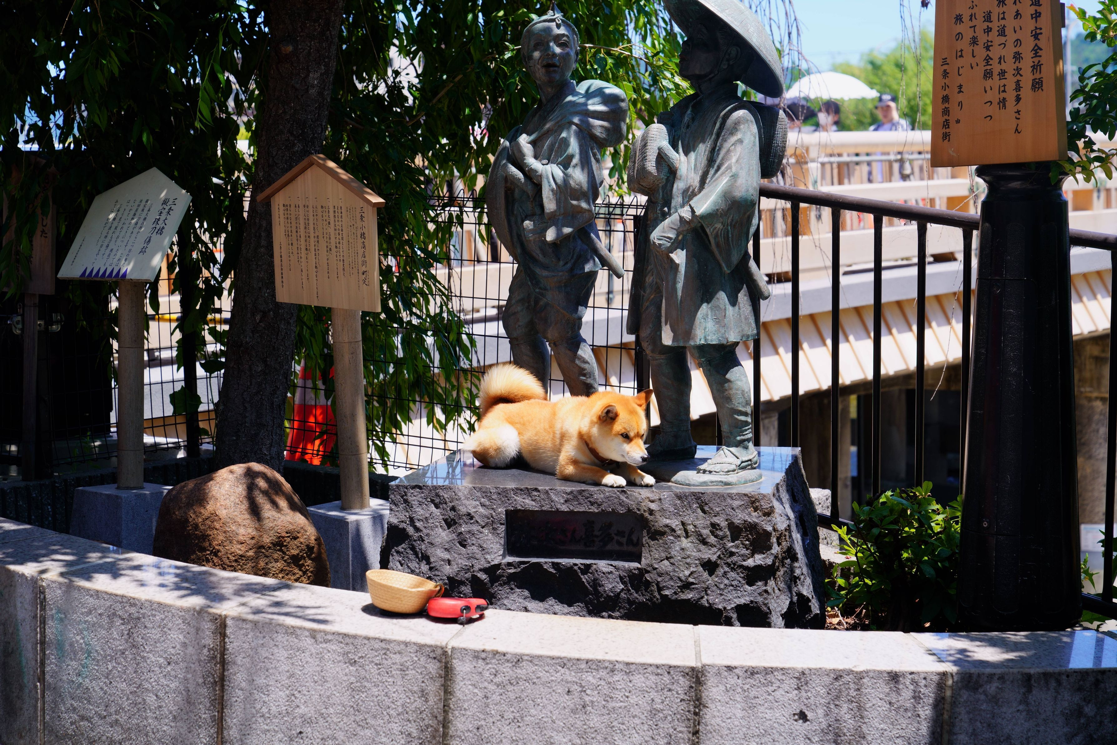 三条大橋でたまたま像の土台に座る柴犬を発見したもの