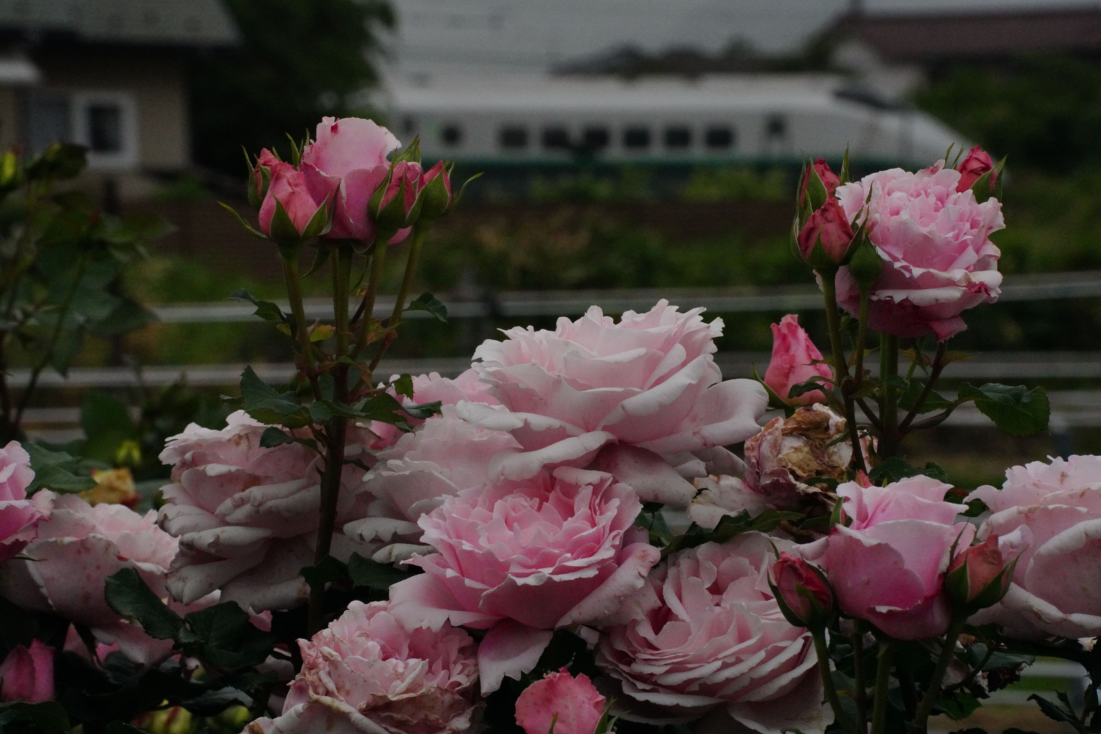 バラの向こうに山形新幹線E3系銀つばさが通り過ぎます。