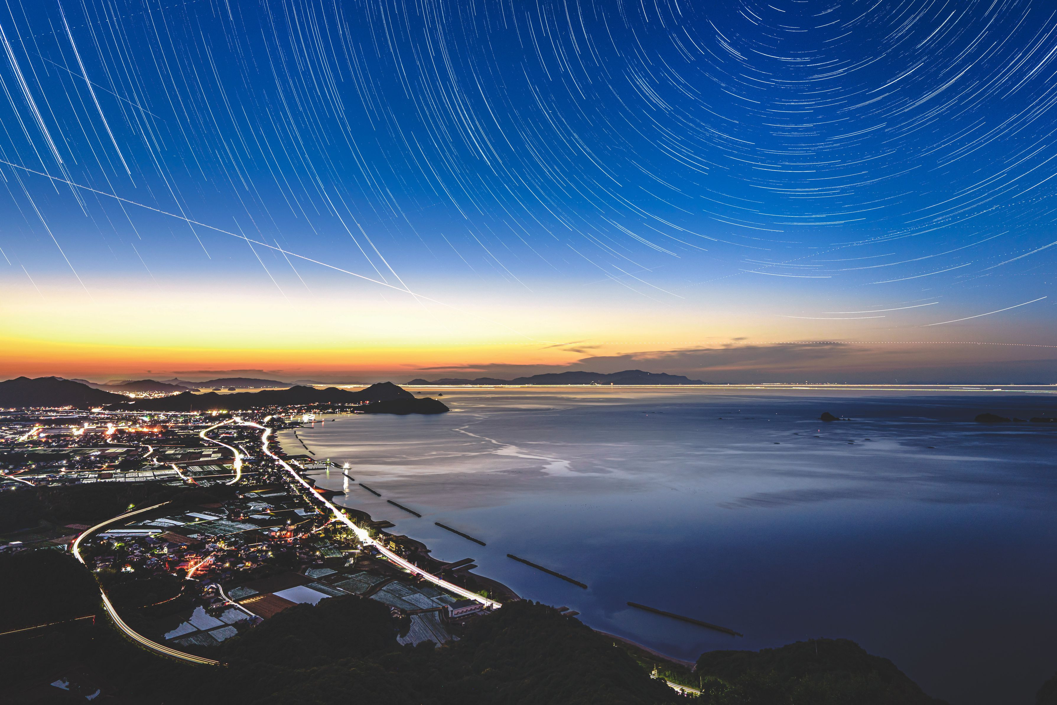 瀬戸の空も海も田園風景もすべてが美しく素敵な眺めがそこにありました。 昨日雨予報がなぜか晴天になり夕景から夜景に移りゆく空を撮り続けたのを比較明で。