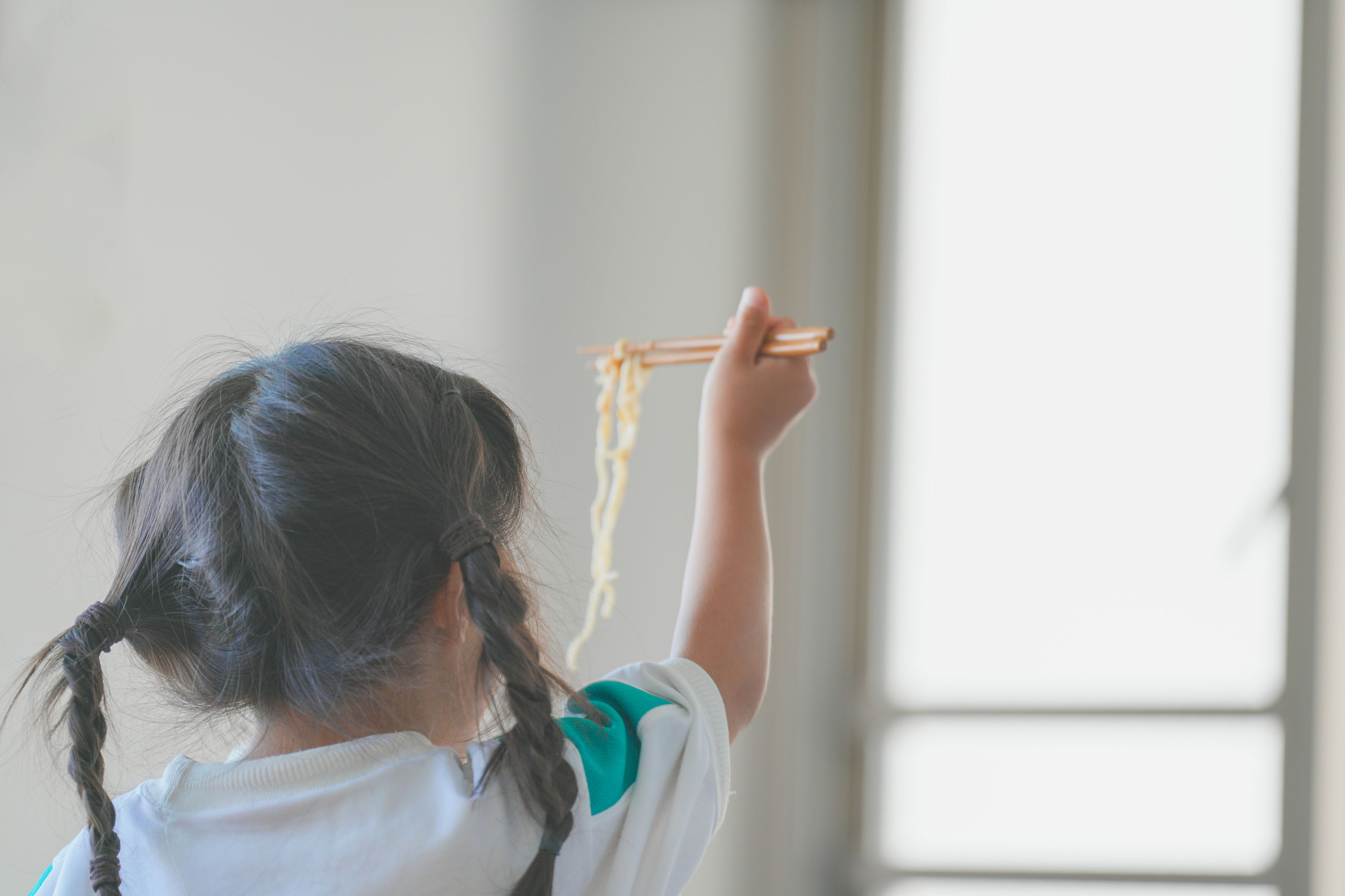 みんな食べ終わり、ひとりぼっちでラーメンをすする妹。「食べ終わったらプールに行くよ」と言うと、元気よく食べ始める。 後ろから、ルンルンしているのが伝わり、思わずシャッターを切りました。