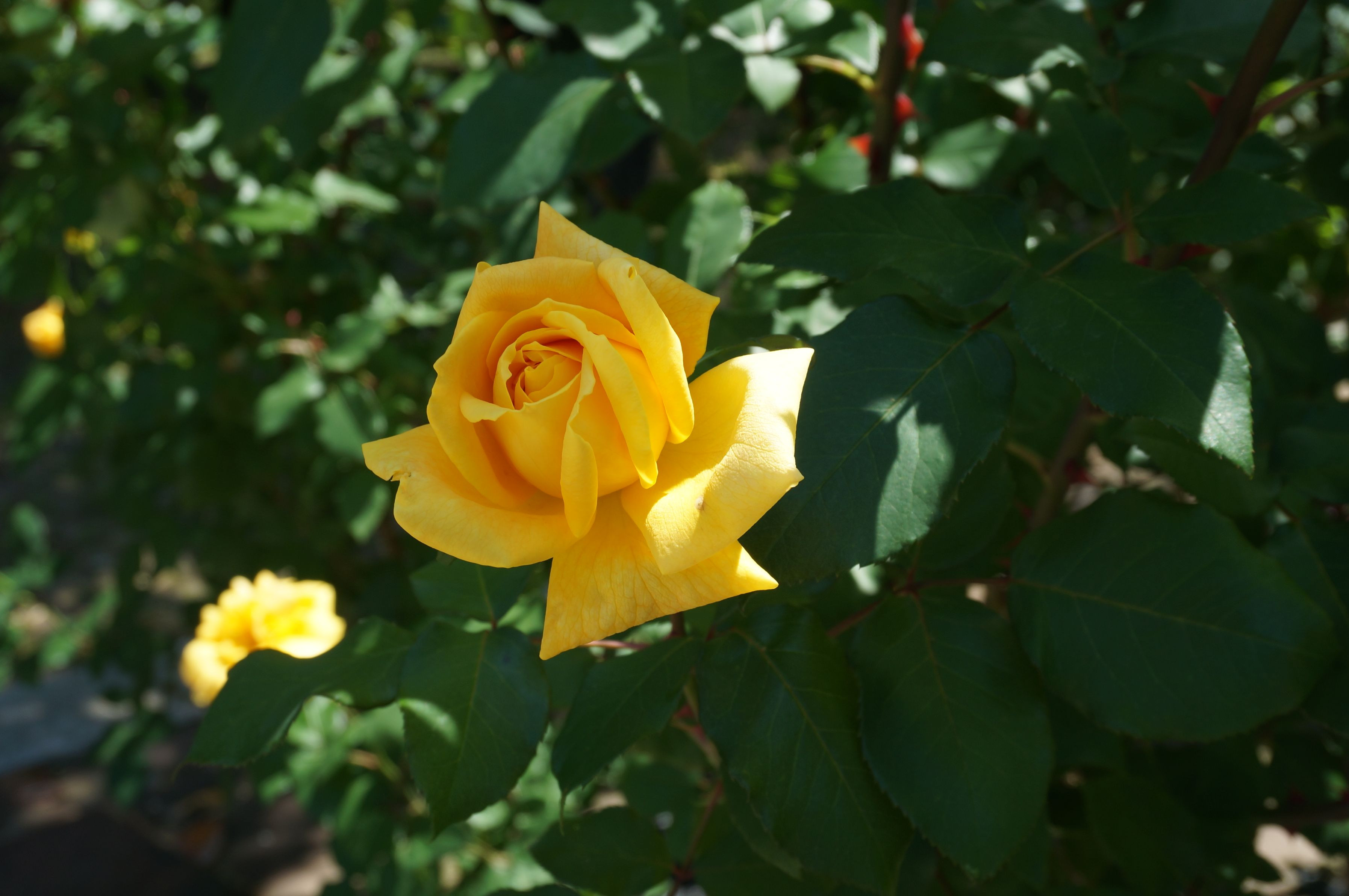 庄内緑地公園にて黄色のバラが輝いていました」。