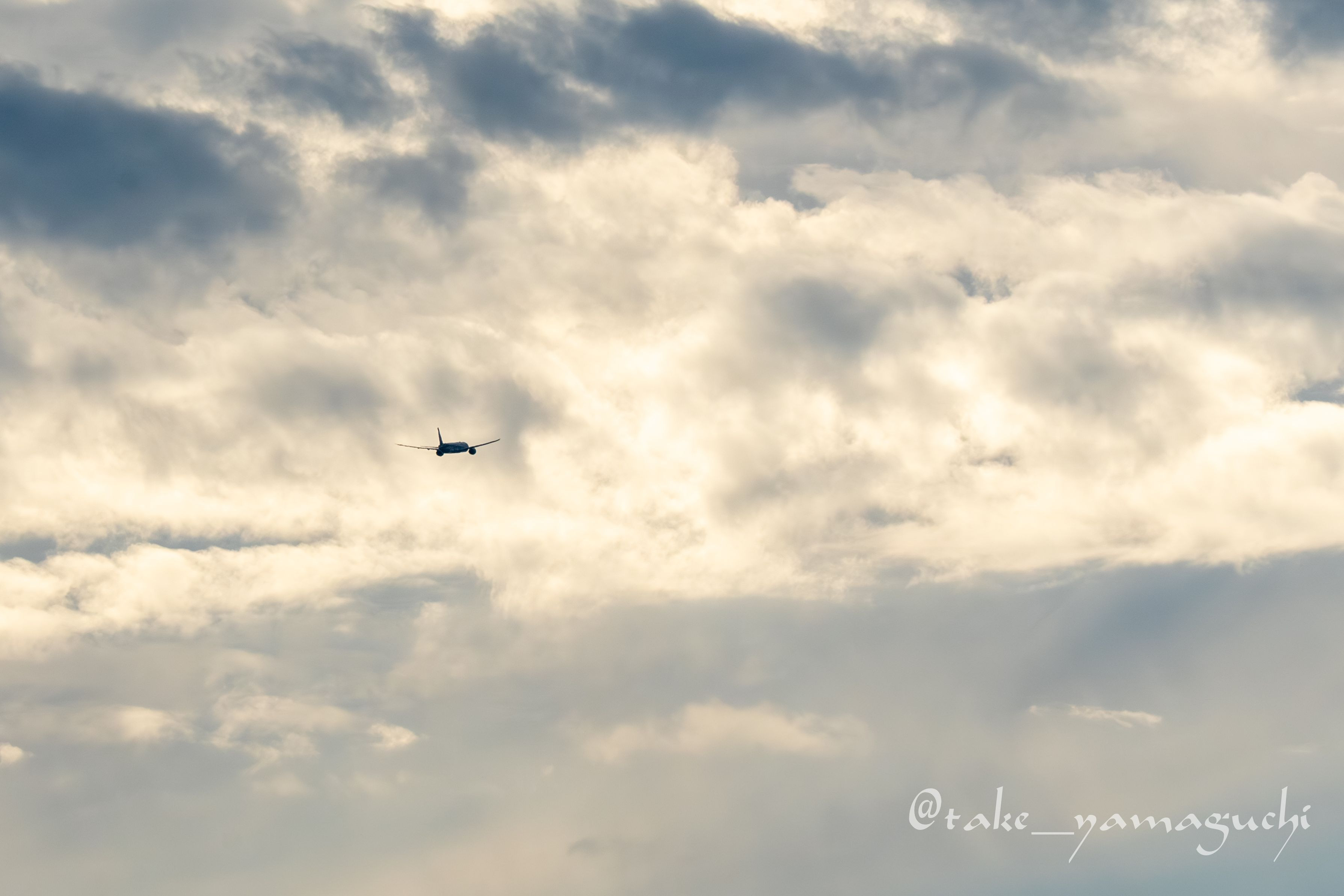 飛んでいく飛行機はありふれた光景ですが、雲間から見える光が美しかったので