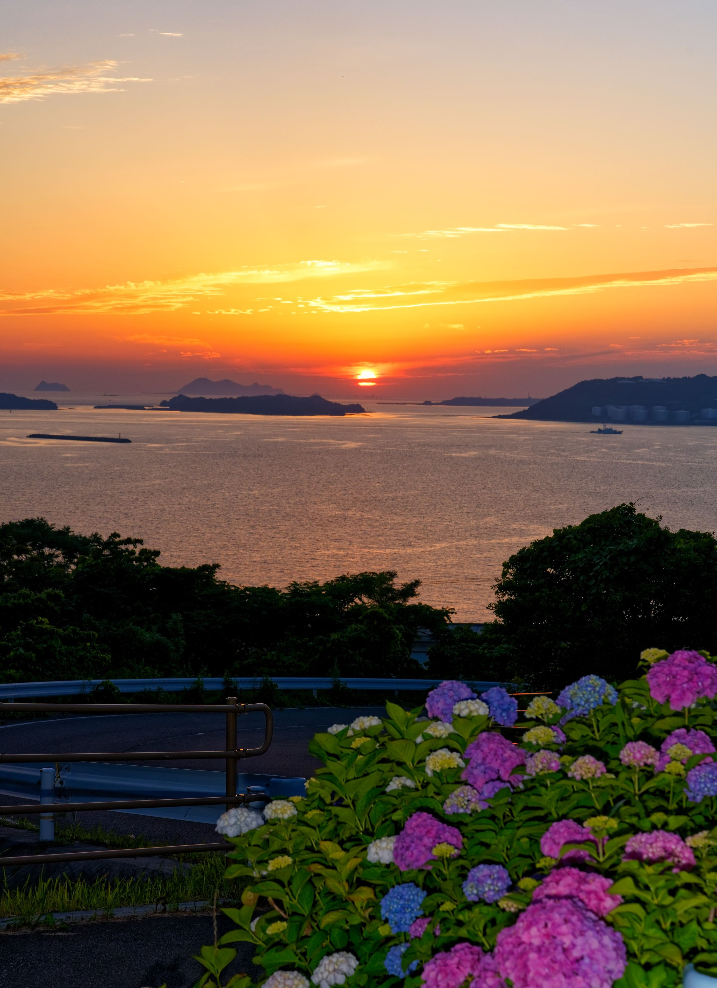 アジサイは雨模様時が似合いますが、夕景とのコラボで撮りました・ ストロボ発光しています。