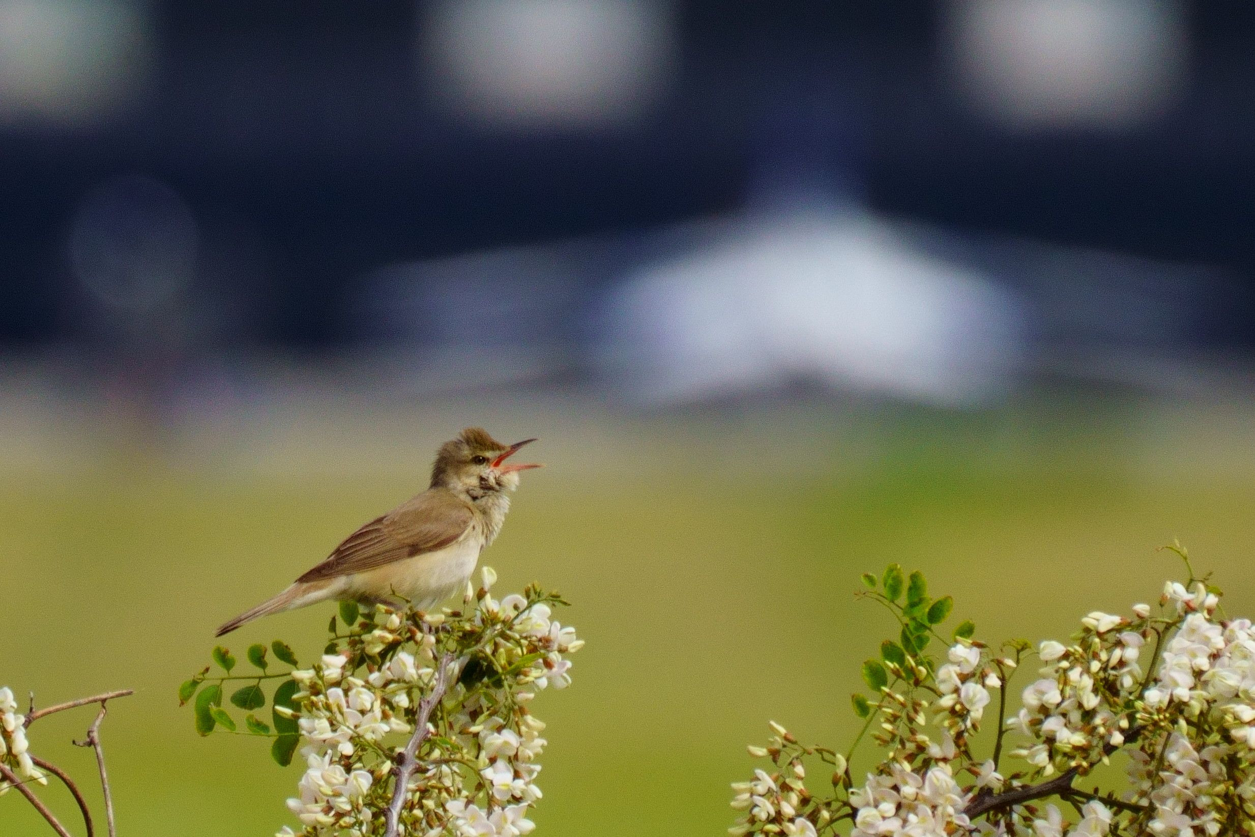 松島基地ブルーインパルス格納庫を背景に、しきりに鳴いていた小鳥(オオヨシキリ?)をパチリ シルエットでも機体が良く分からないですが、そこはご愛嬌ということで (^^ゞ