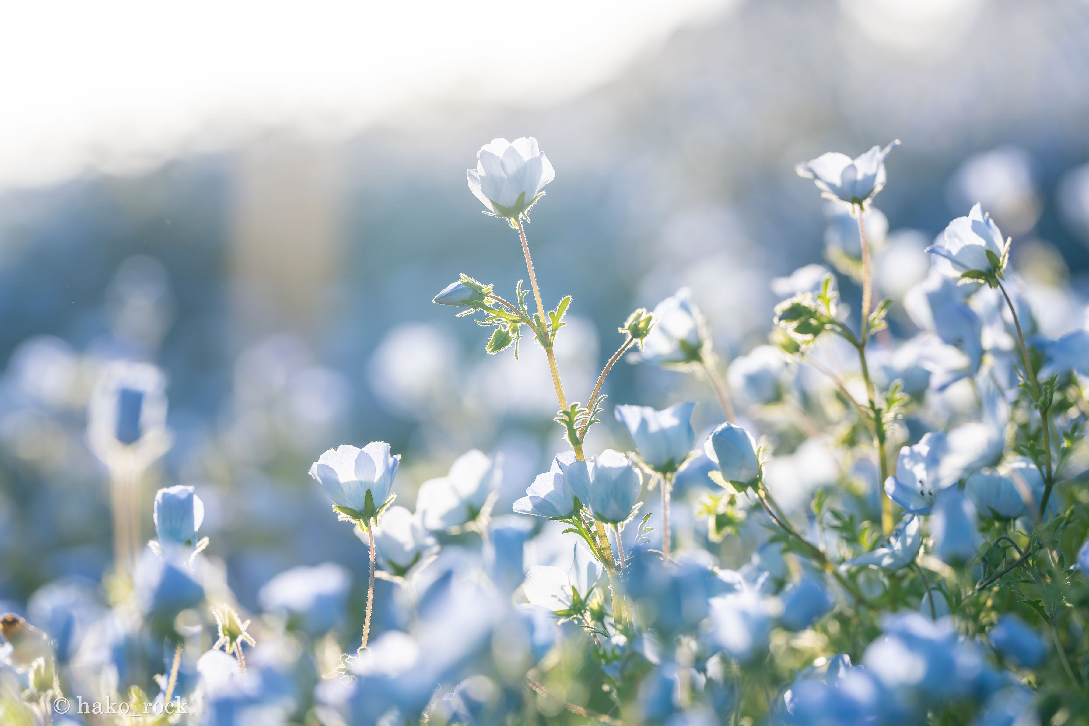 夕方より少し前の太陽の光を浴びるネモフィラたち