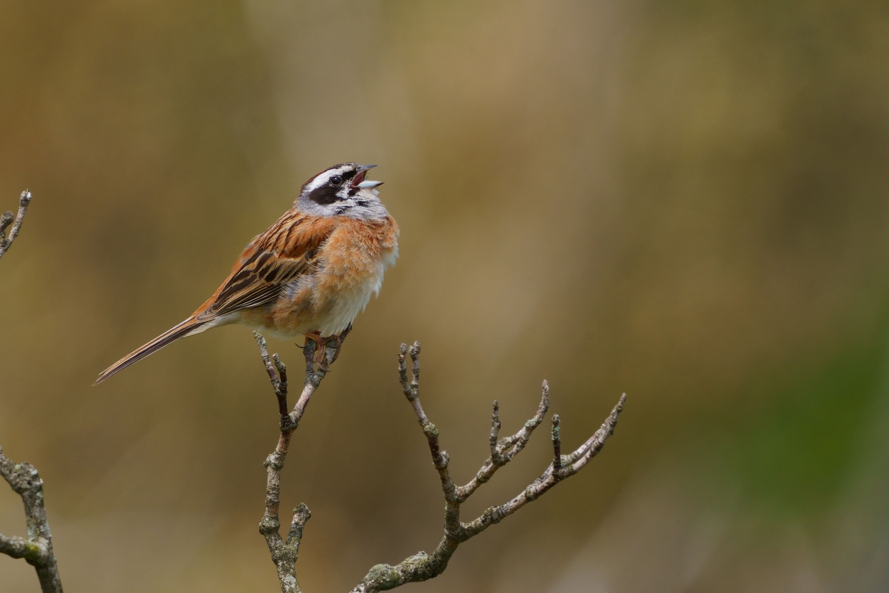 図鑑の解説通り、木のてっぺんで胸を張って鳴くホオジロ。しばらく鳴いていたので良いアングルの絵が撮れました。