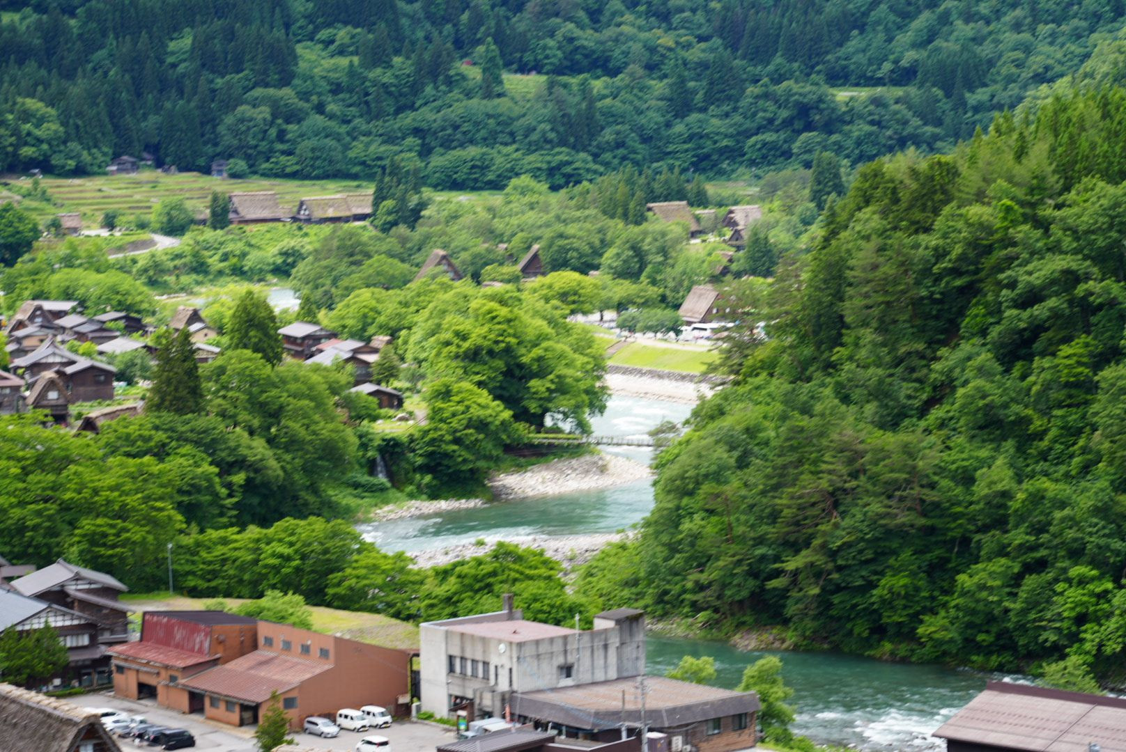 白川郷・五箇山の合掌造り集落の展望台にて撮ったものです。 曇っていますが、白川郷の茅葺き屋根あまり映っていなくてすみません💦 白川郷の自然の描写がよく撮れた1枚です。