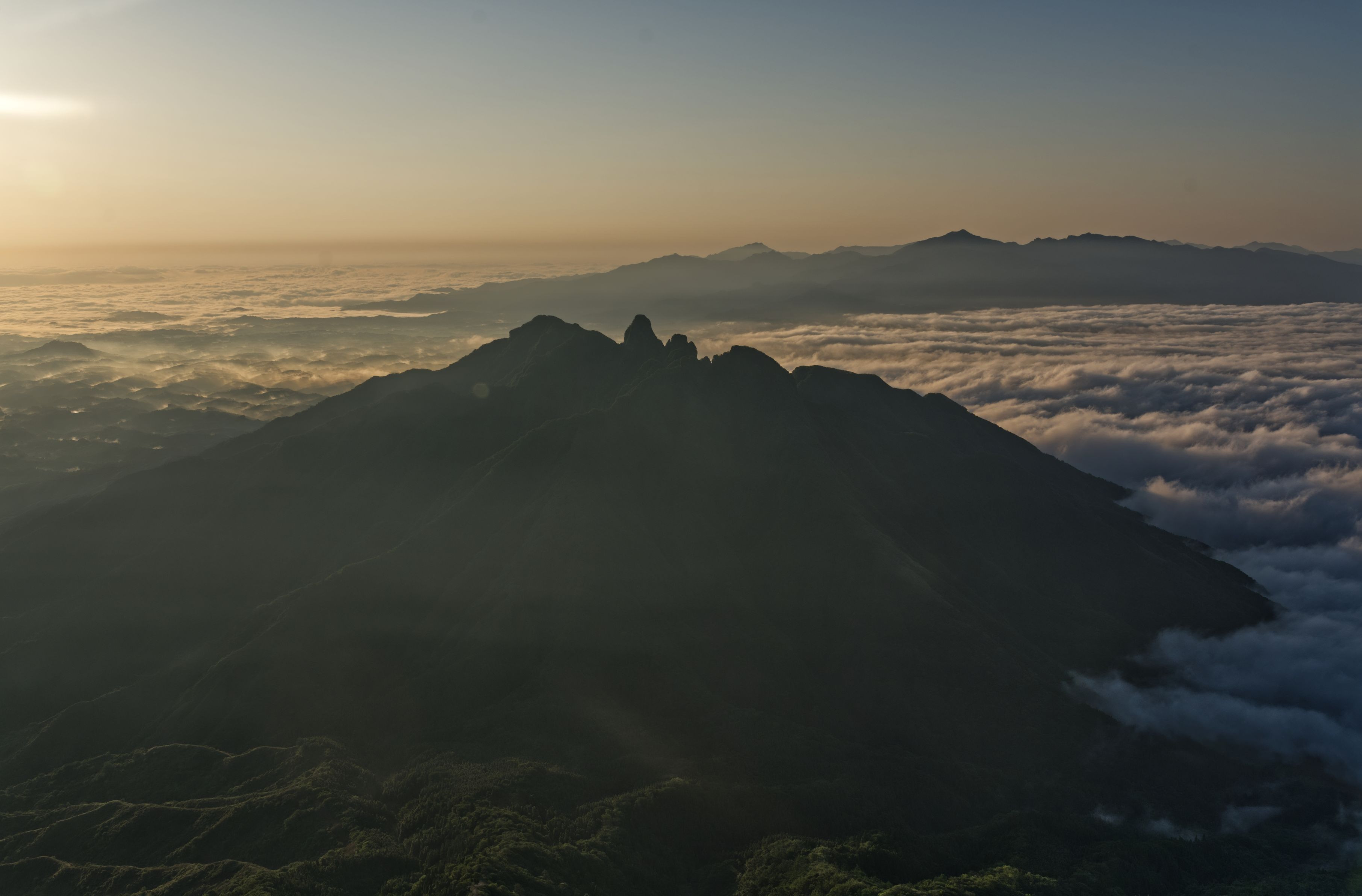 朝日と雲海で最高のシルエットが見えました。 高岳から根子岳を臨む