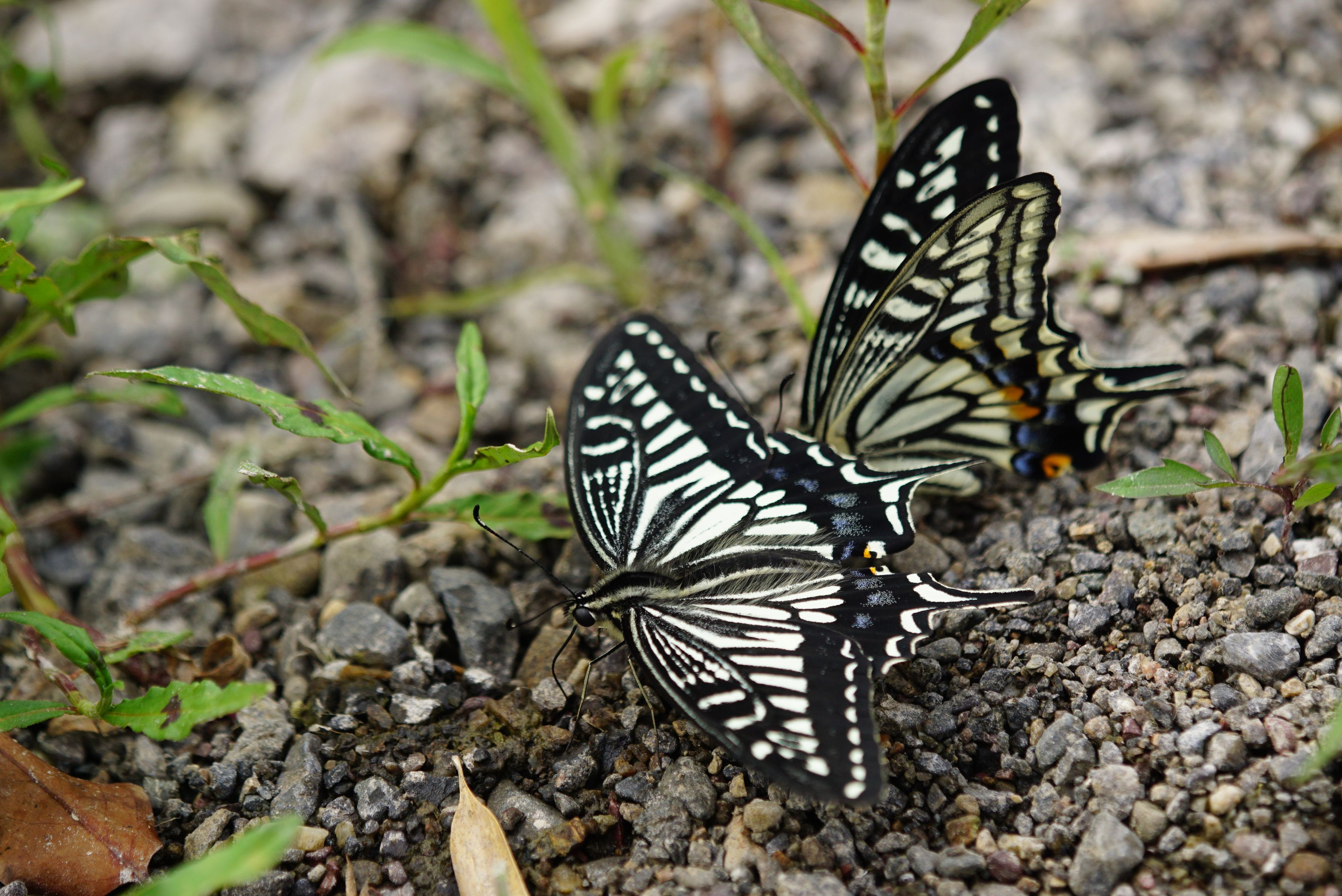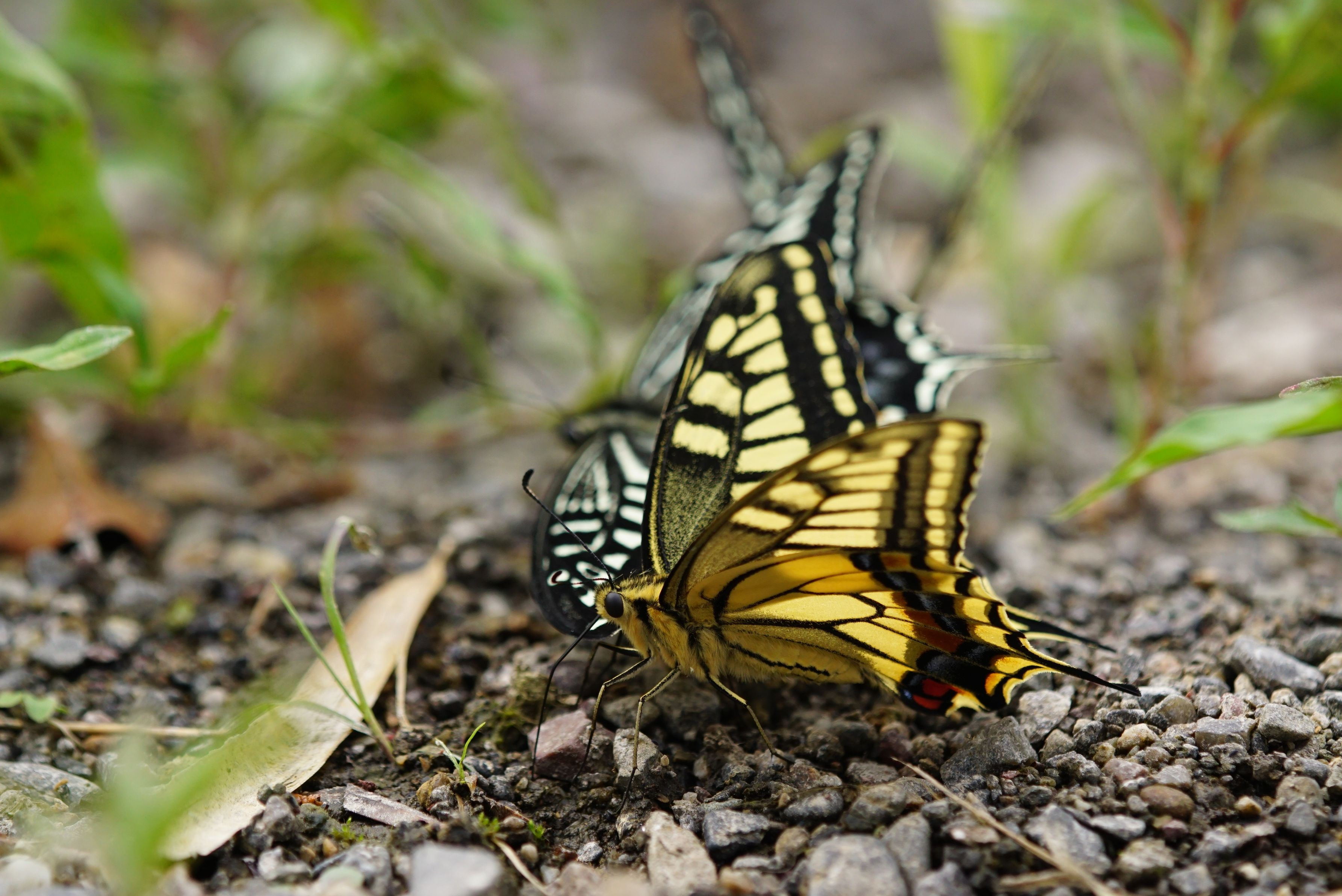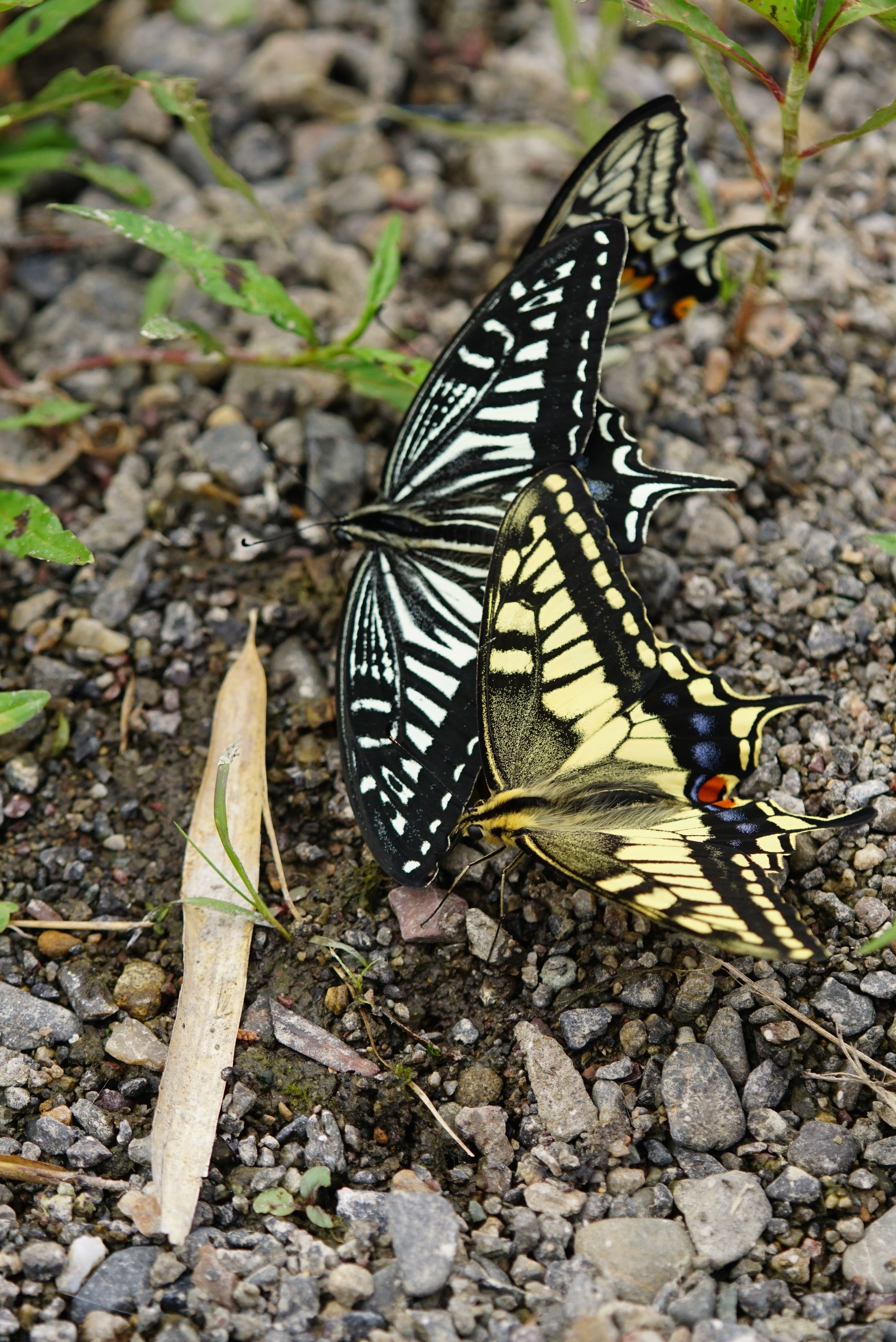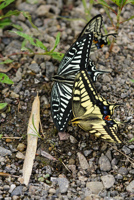 初夏の河原の獣糞にやってきたナミアゲハ夏型の♂×2。そこにキアゲハ夏型の♂が合流です。
