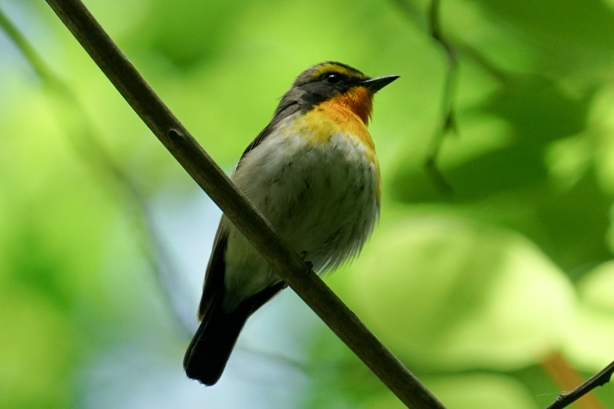 この時期よく聞く美しい囀りの主 オオルリばりと言ったら褒めすぎかな。しかし、大きく綺麗な声、黄色からオレンジ色の美しい色彩の躯体と相まって大好きな小鳥の一つです。