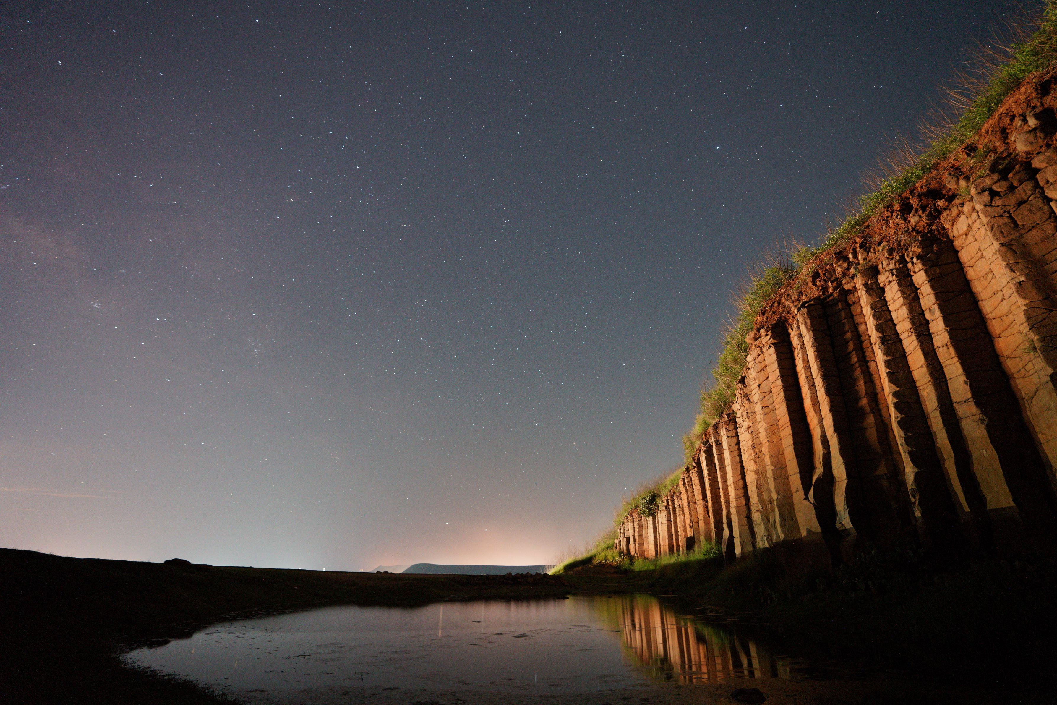 台湾の離島 澎湖 (ポンフー) は玄武岩が非常に多く、柱状節理が間近に観れる場所も多い そのなかでもお気に入りの場所で星空を眺める 近くの漁港の灯りがまぶしく、柱状節理も明るく見える