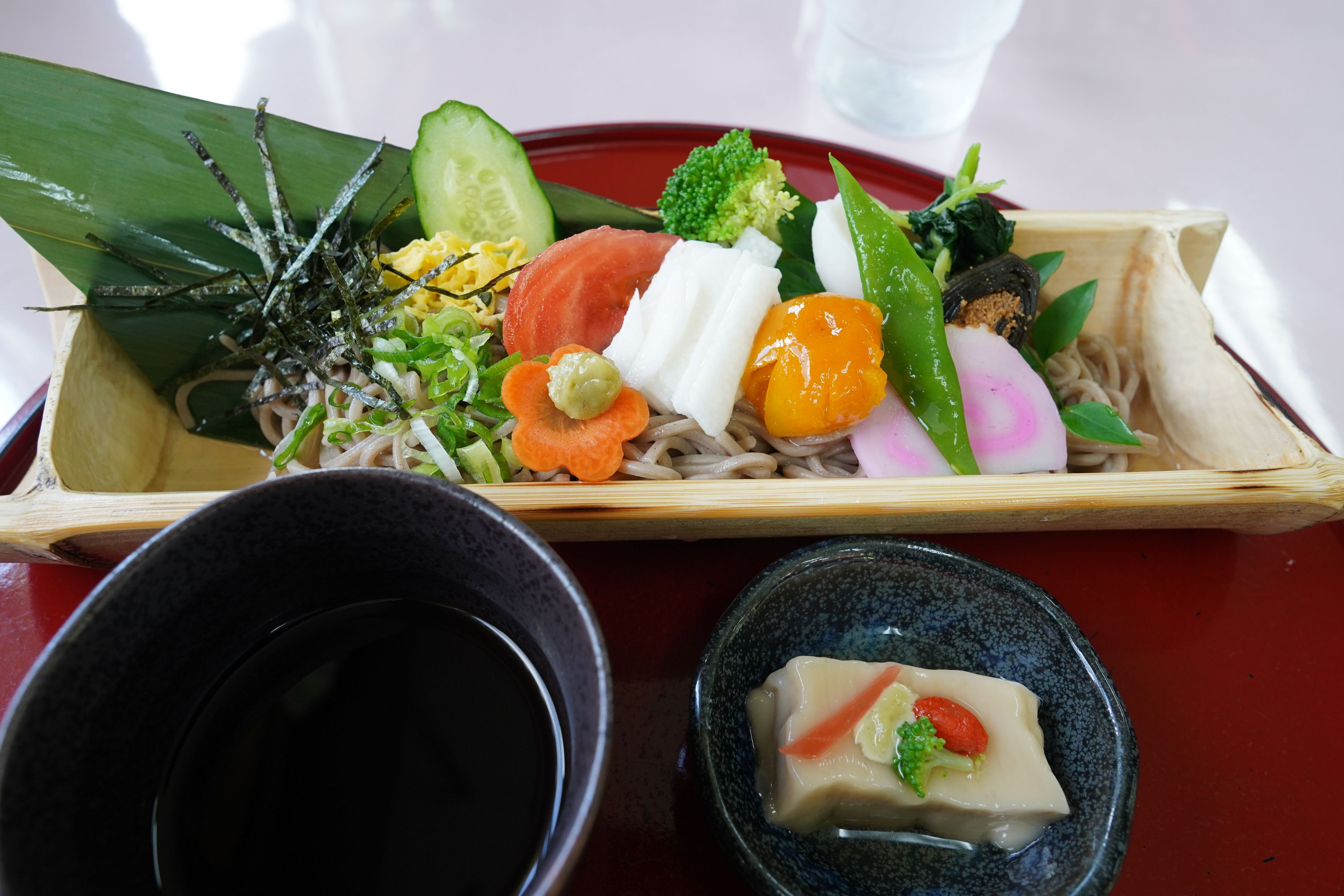 とてもカラフルな盛り付けで「映える」被写体ですが、そばも腰があり、香りもあり美味しかったです。大社のたくさんの階段を上がり降りした後だったので冷たいおそばが最高でした。