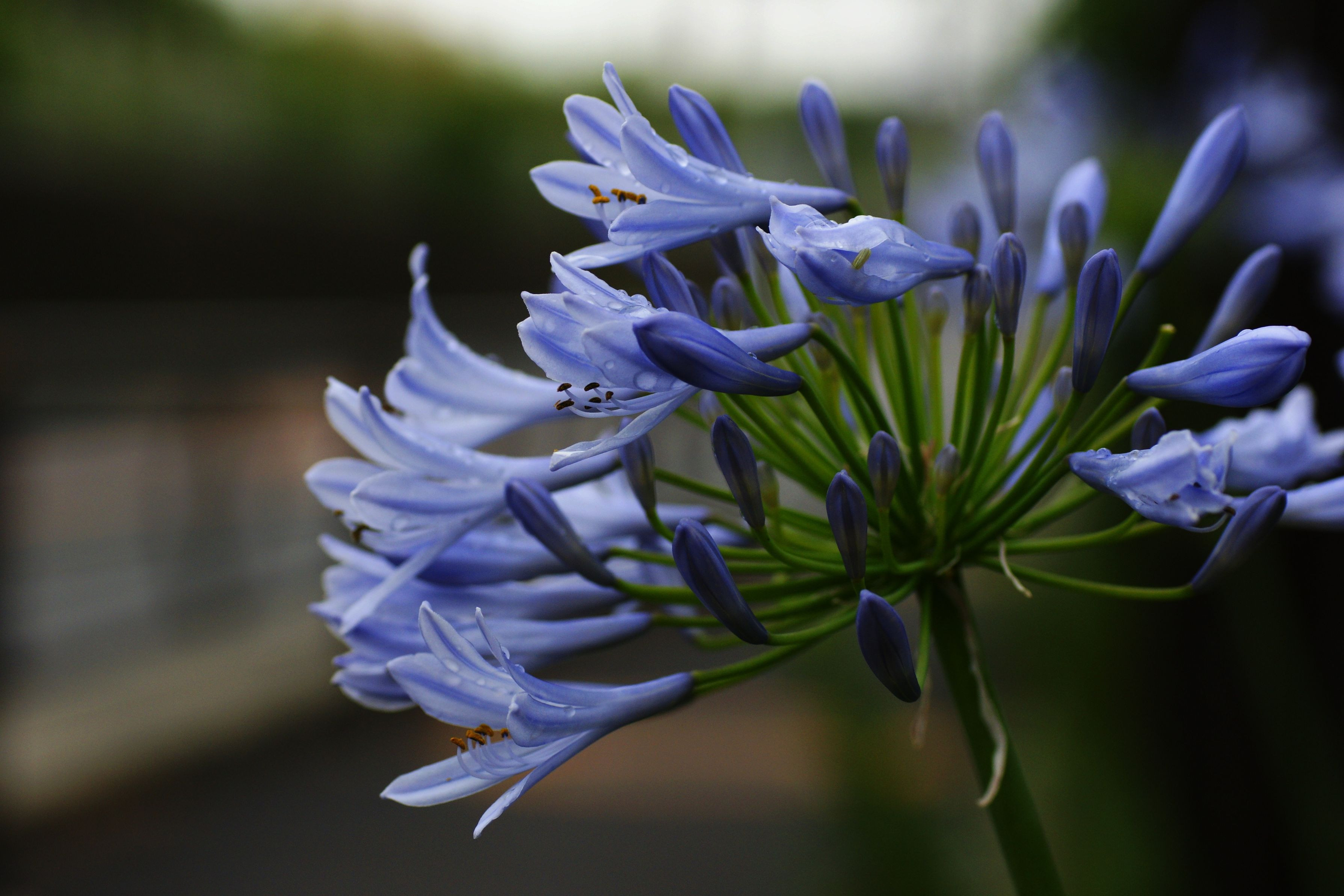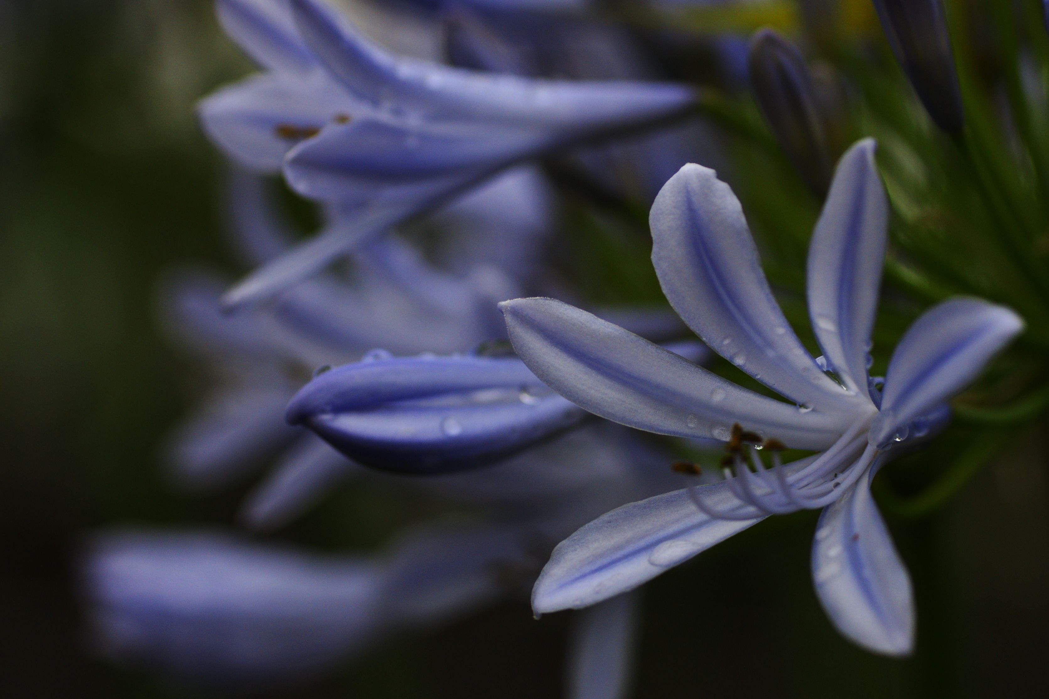梅雨のうっとおしい小雨の中、傘をさしてご近所に。重たい空の下、水滴を纏うアガパンサス。自分の気持ちを込めてアンダーで。