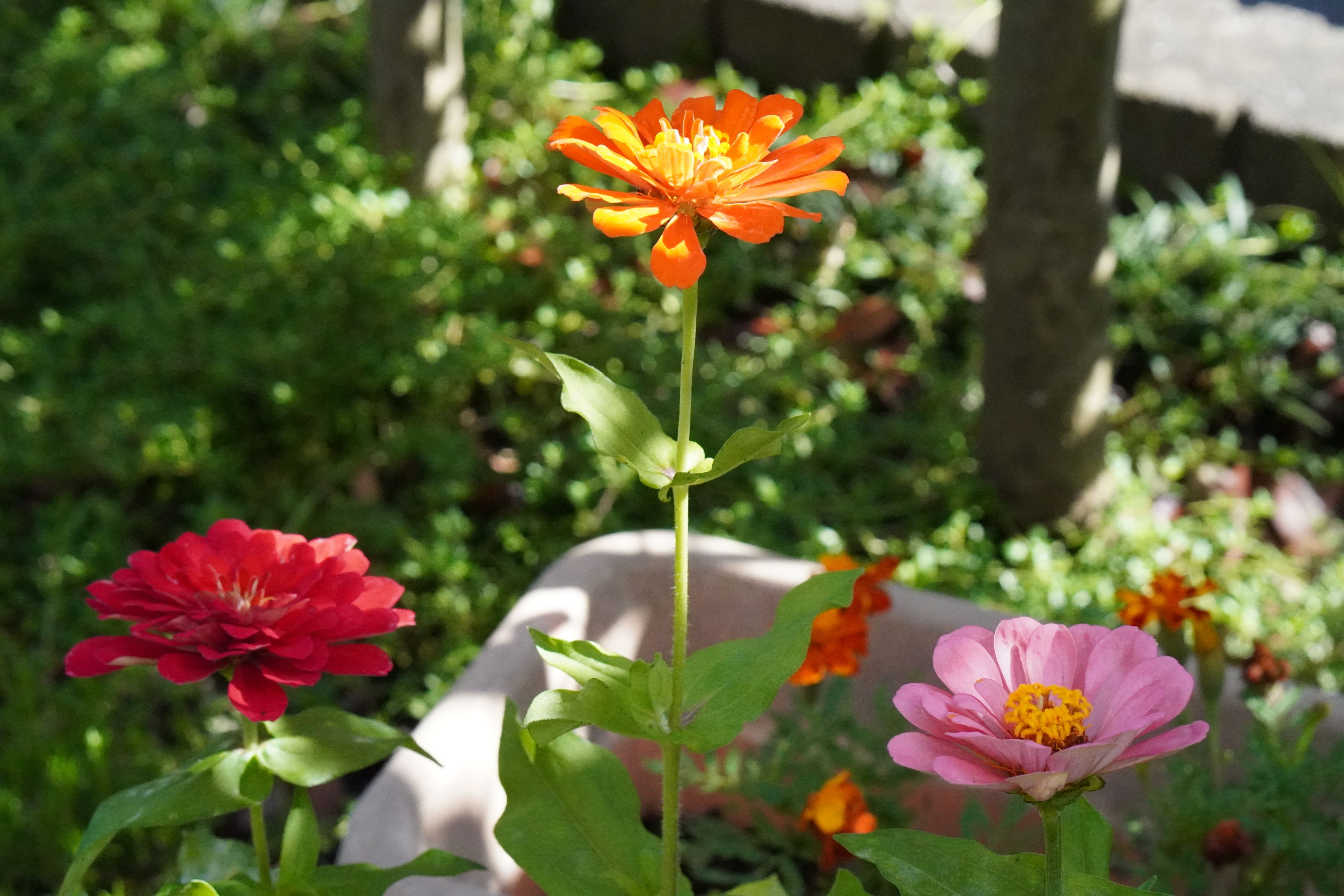 我が家の庭に、いただいた百日草が咲きました。何色かも分からず同じプランターで育てておりました。