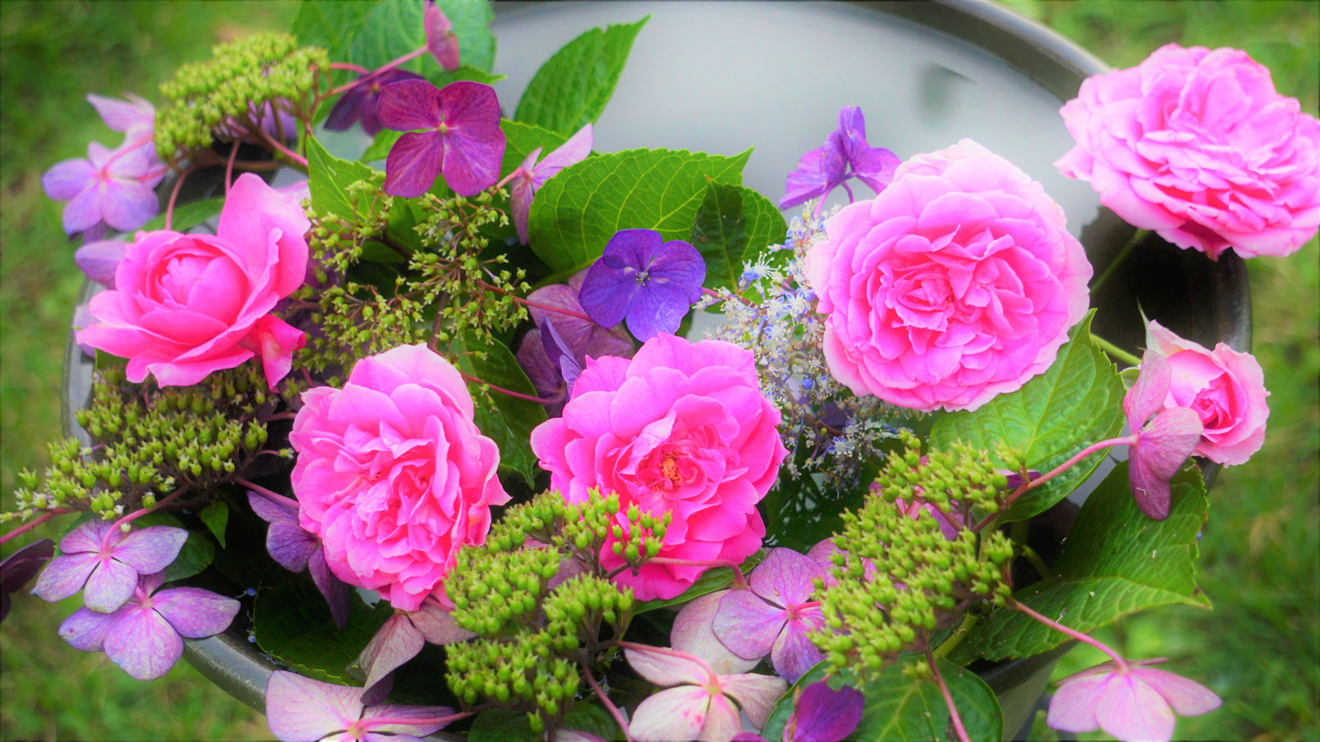 庭に咲いている花を、水鉢に浮かべて、おうち花手水・・