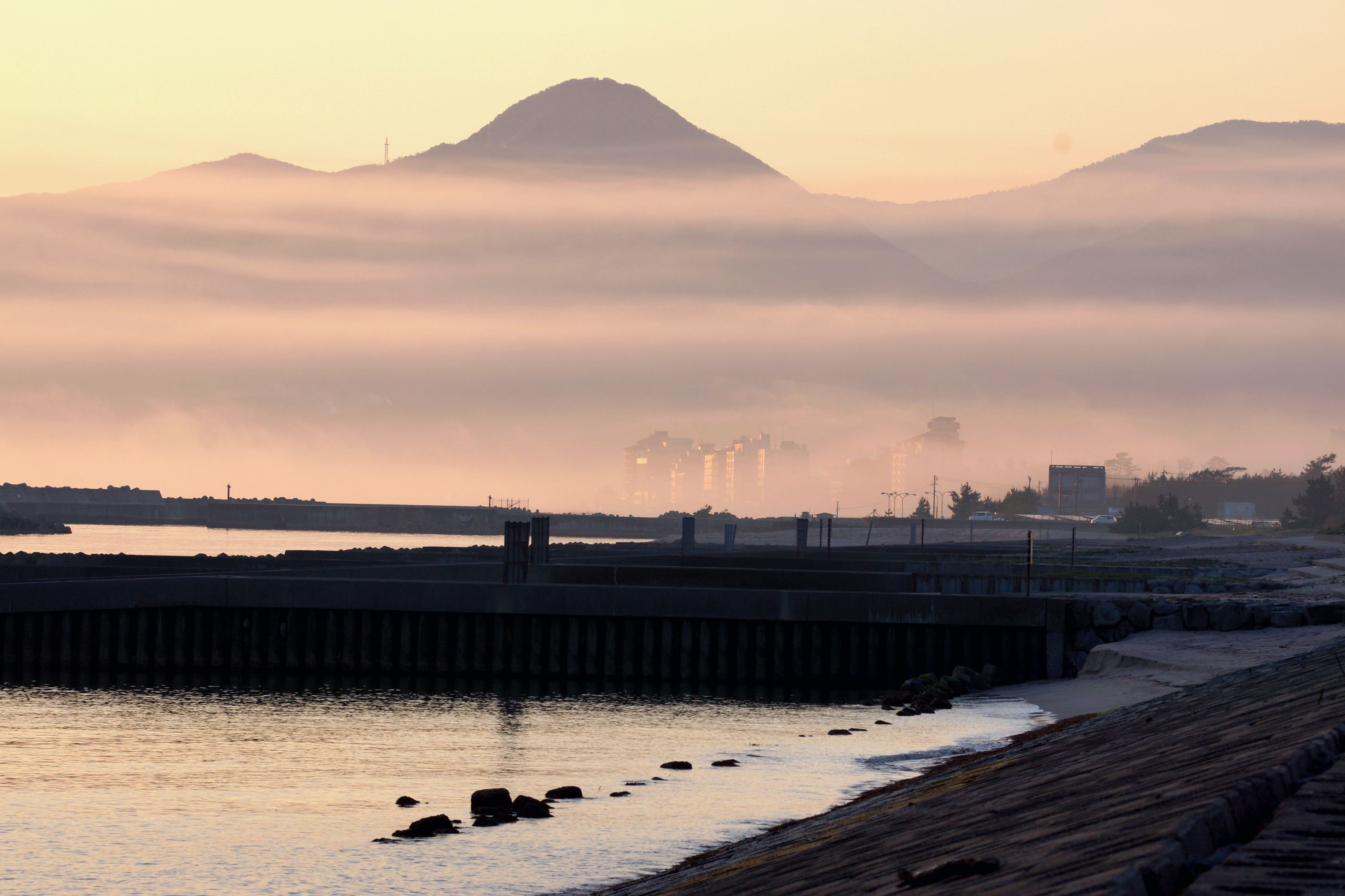 #新人応援CP2023# 米子市皆生温泉街が海霧に包まれていました。 #鳥取県#
