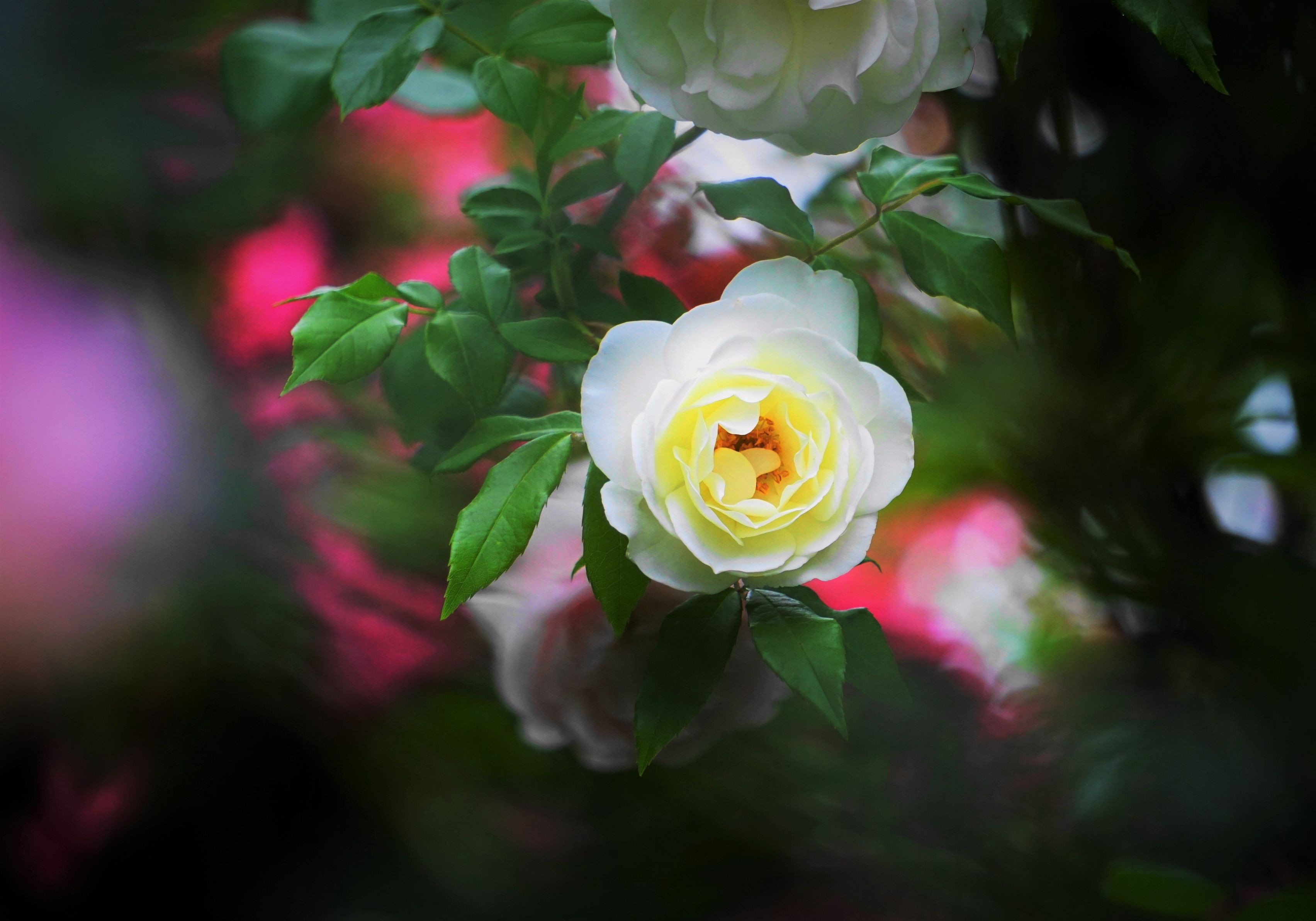 白薔薇が美しく咲きました。背景に赤い薔薇を入れて・・風を待ちました。 撮影 庭にて