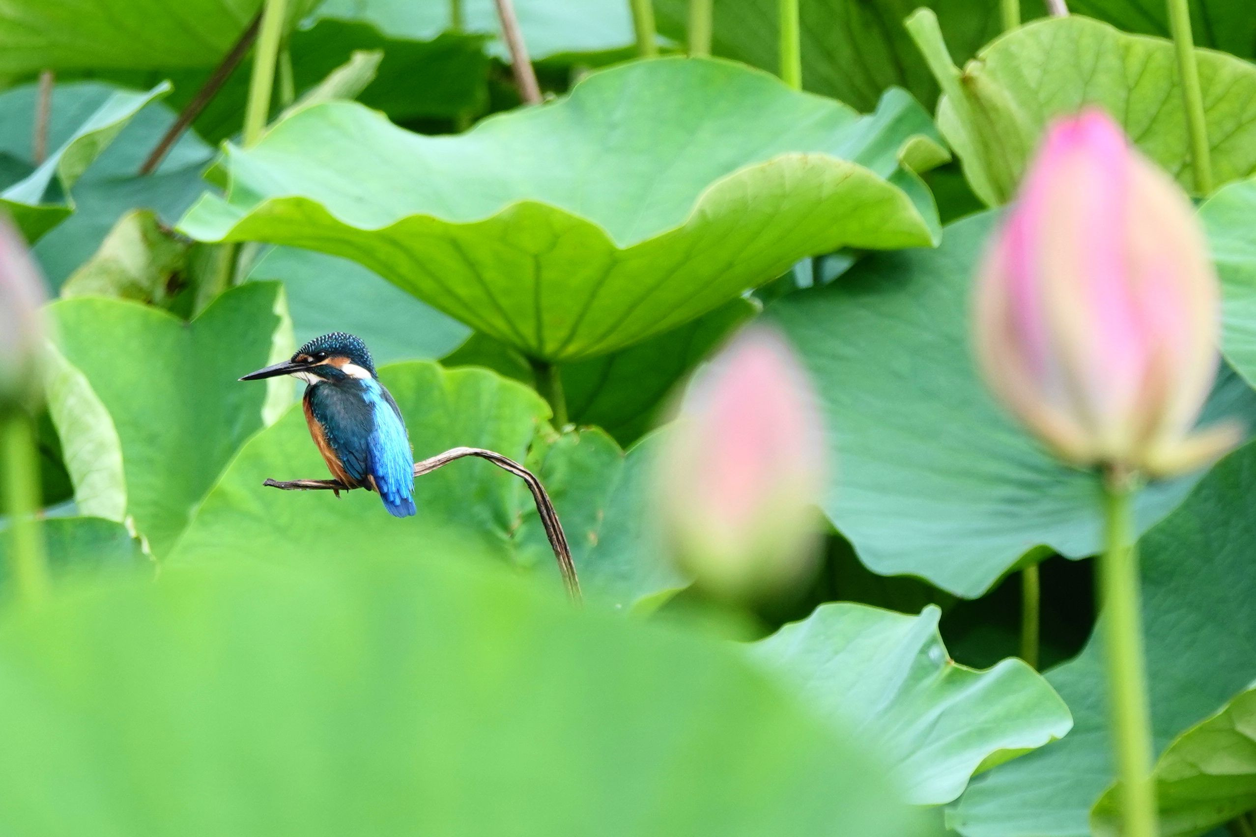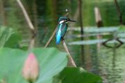 ハス池は、古代ハスで満開です。そこに、念願のカワ君がやってきました。 未だ、ハスの蕾、花には止まりませんが、枝に止まって毛繕い、ストレッチを してくつろいでいます。