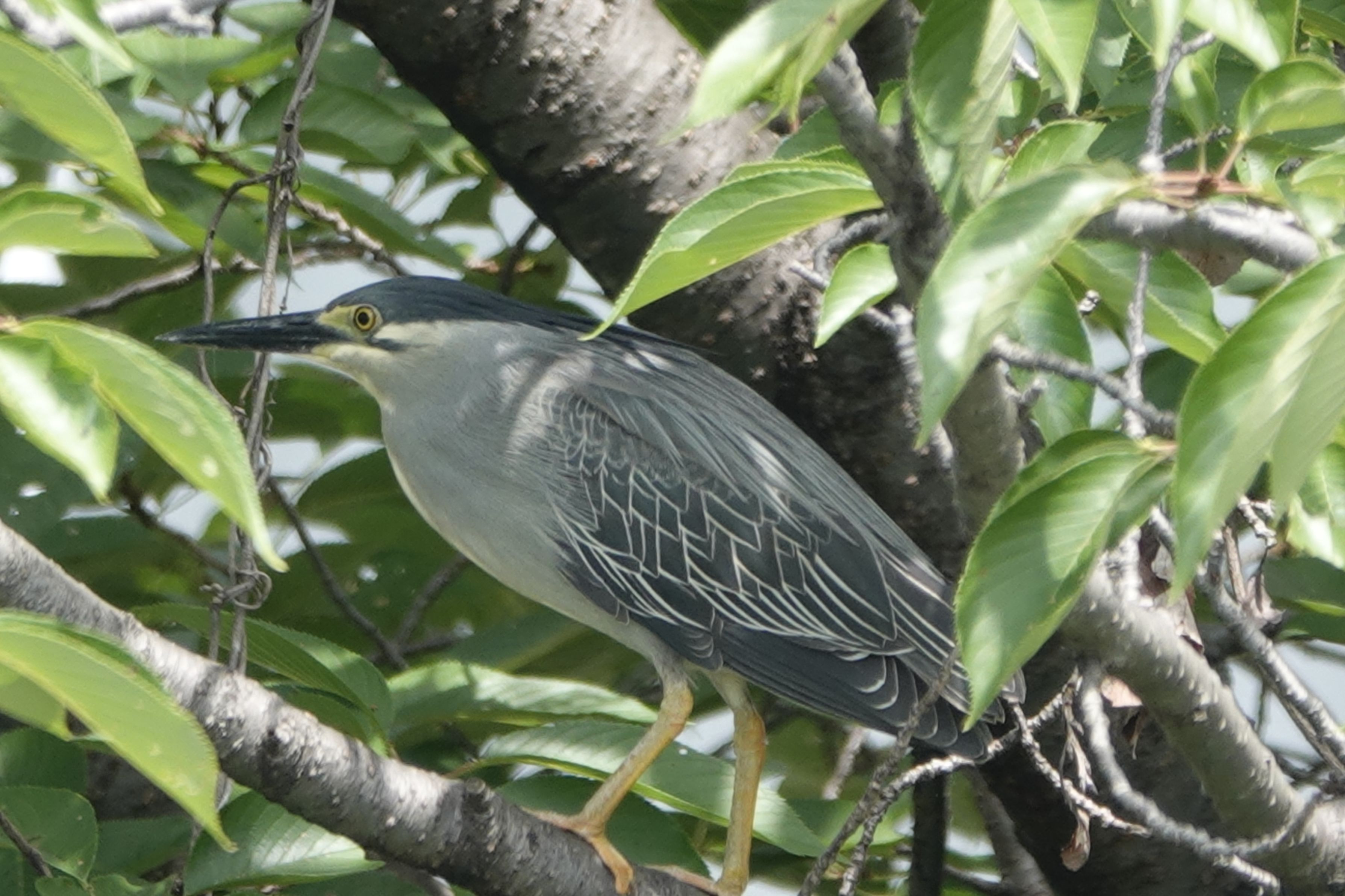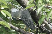 木々の枝の間にとまるササゴイの毛繕いをしているところを撮って見ました。