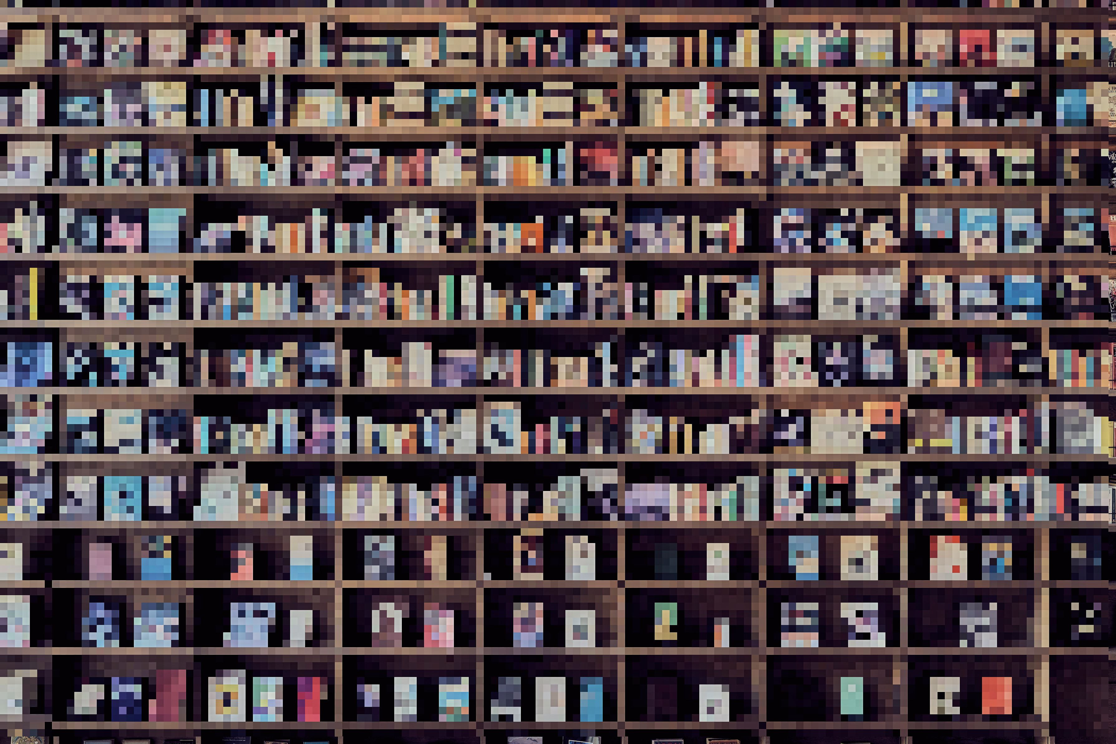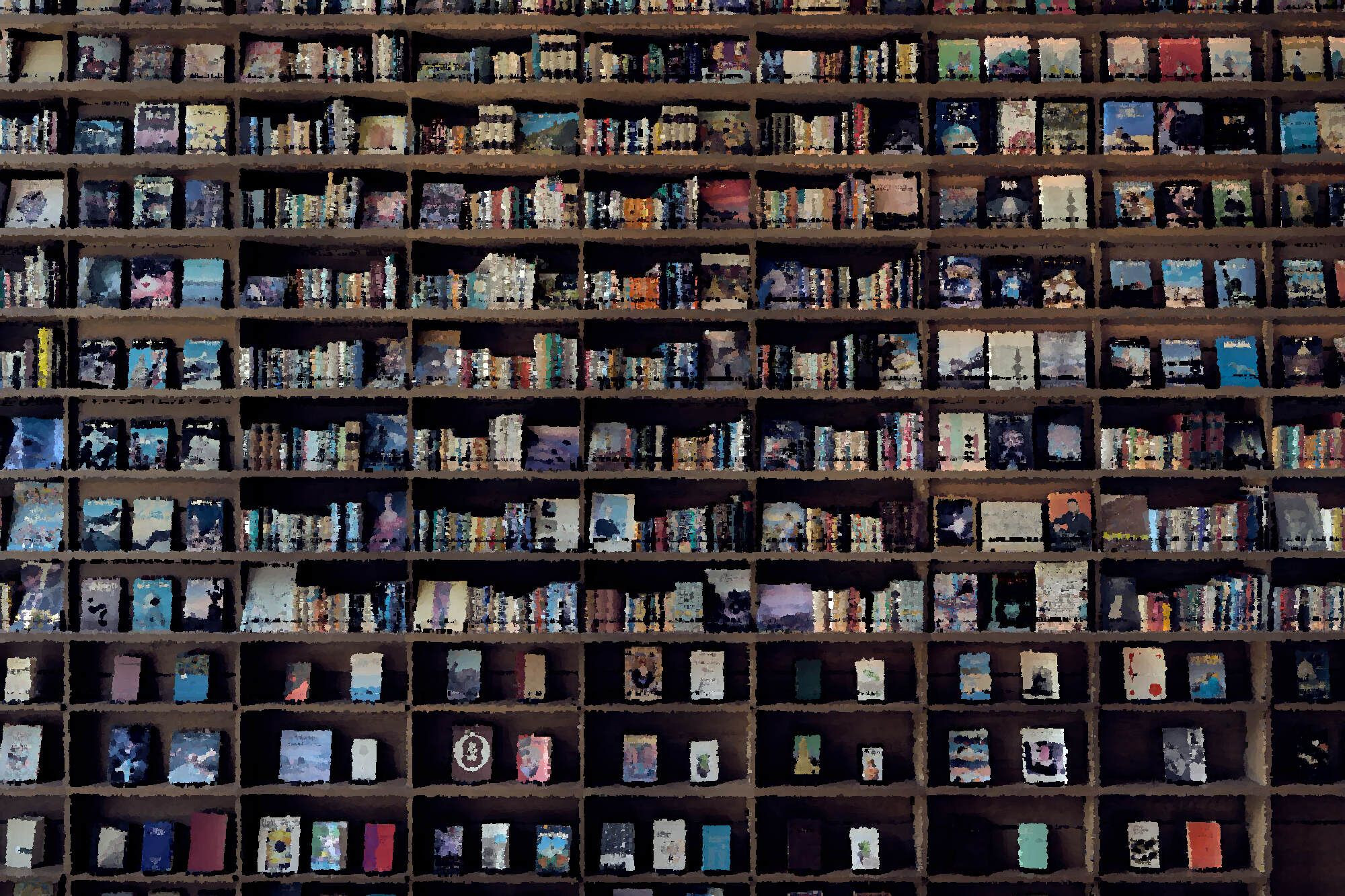 ある書店の書棚です。ずらりと並んだ本に惹かれるのは、その整然としたカラフルさにあると思い、それを強調してみました。加工にはフリーのソフトを使っています。