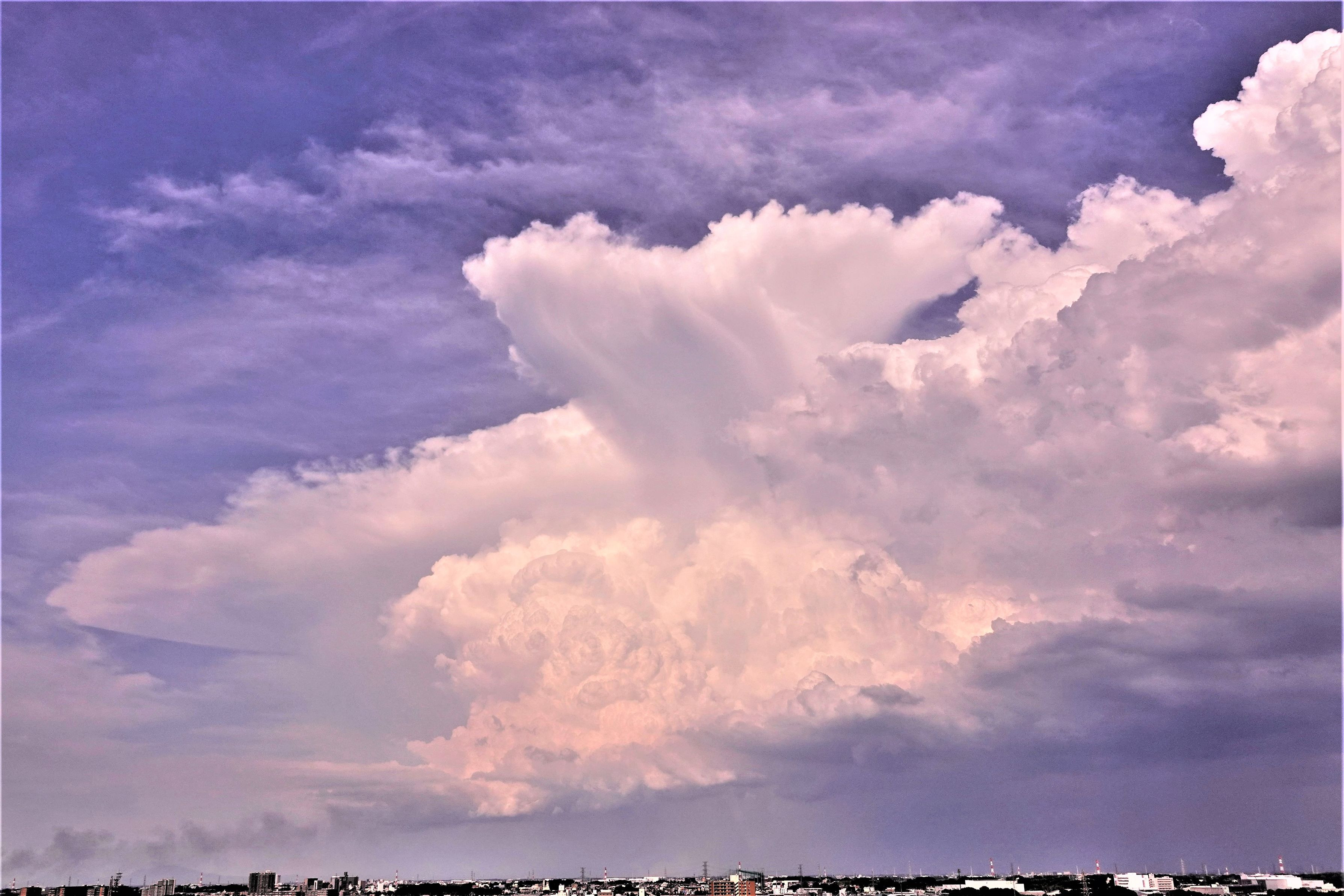 暑中お見舞い申し上げます 今日は36度、暑かったですねっ! 今日はちょと変形の入道雲?を発見 円盤型の薄く広がった雲を見つけて眺めていると 次々と下から入道雲が湧き上がってきて迫力のある形になりました。 夜の稲妻を期待しましたが、肩透かし、、、 雑用に追われて、隙間時間に写真は撮っているのですが、 薔薇も花菖蒲も整理が出来ないでいます。