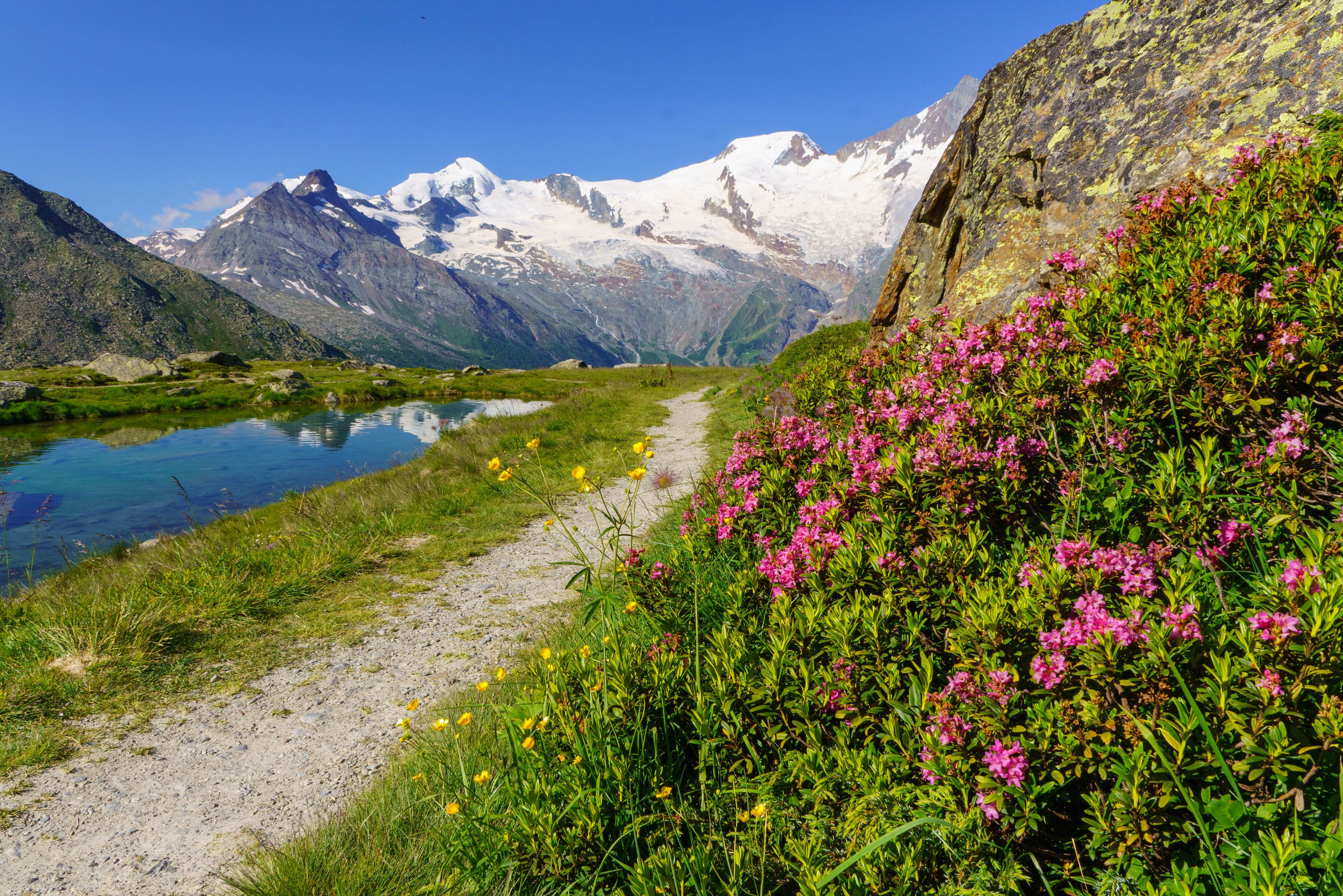 (追憶2019ーー今のところの人生最後のスイス旅行)ーーこの度では初めてサースフェーに宿泊し、クロイツボーデン(標高2397m)からサースグルント(1559m)まで、4000m級のミシャベル山群を眺めながらハイキングを楽しみました。クロイツボーデンにある小さな貯水湖の畔に咲くアルペンローゼとキンポウゲの奥にはアラリーンホルン(4027m)とアルプフーベル(4206m)が見えます。
