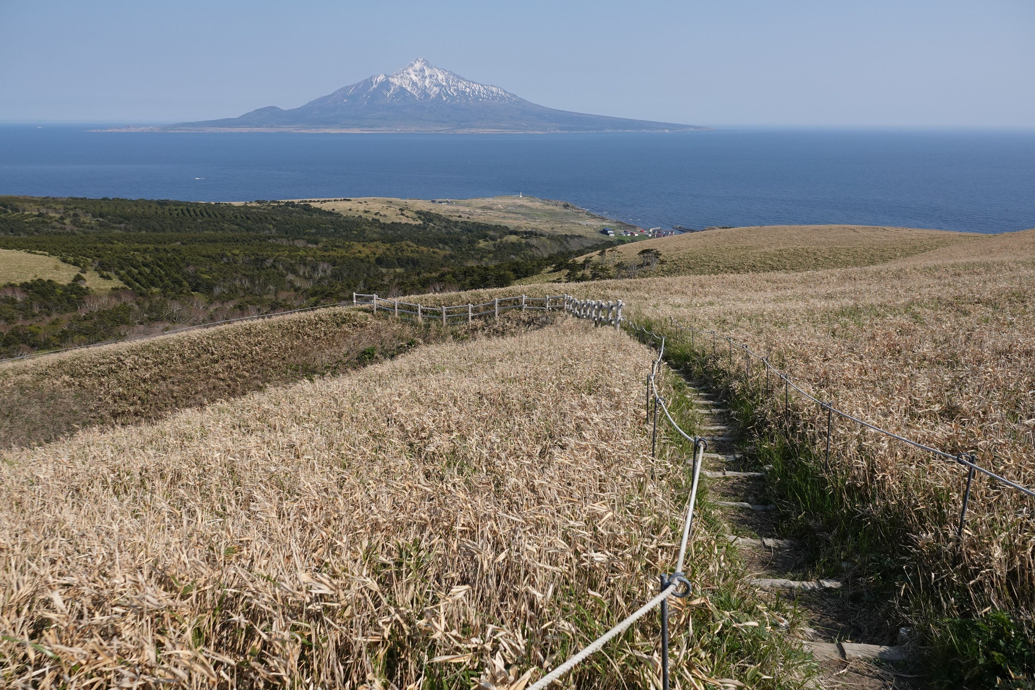 礼文島 ツバメ山から桃岩トレッキングコースを、 海の向こうに利尻島と利尻山を望む 2023/05/14