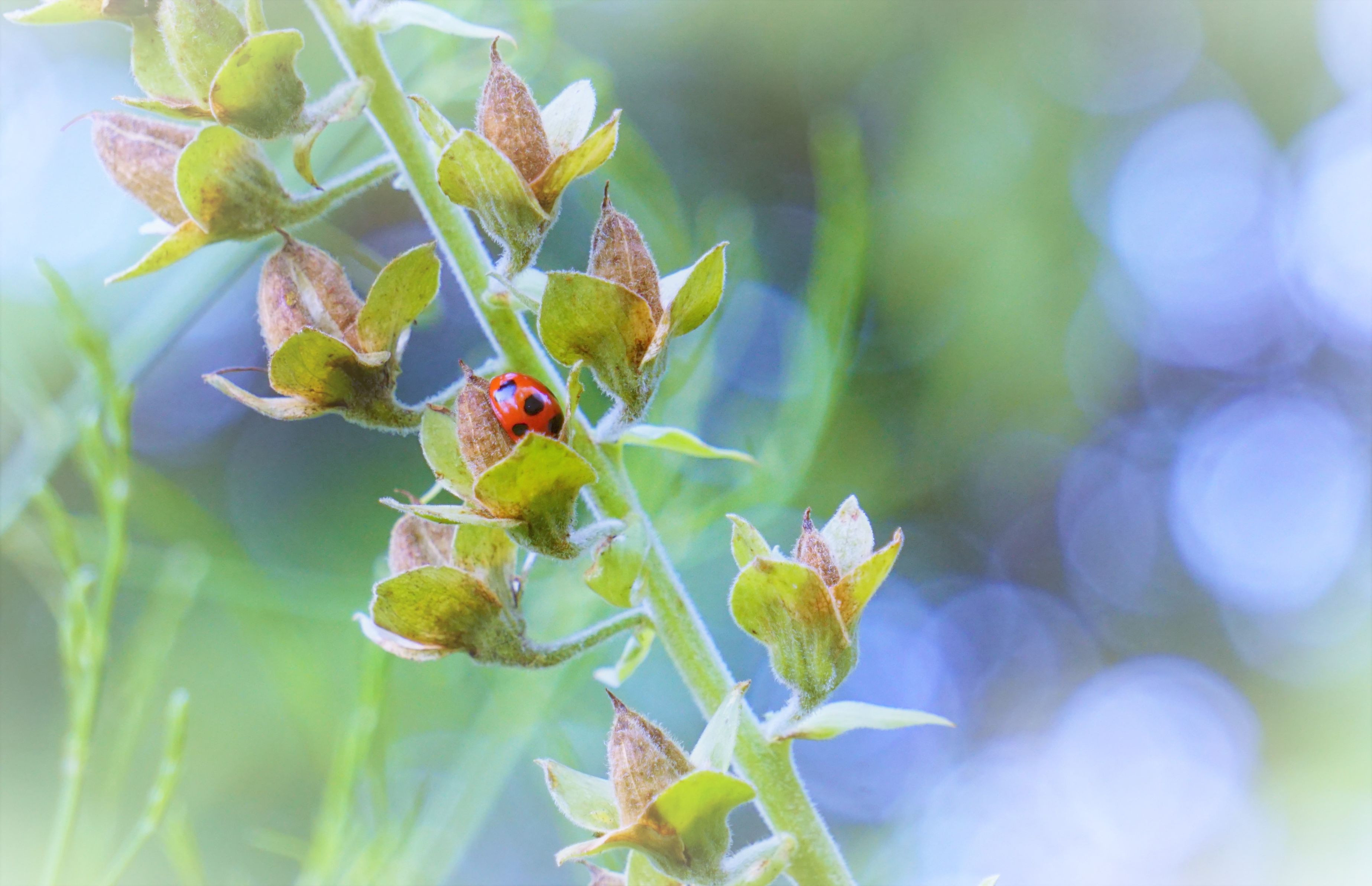 ジキタリスのガクに頭を突っ込んで寝ているテントウムシさんです♪