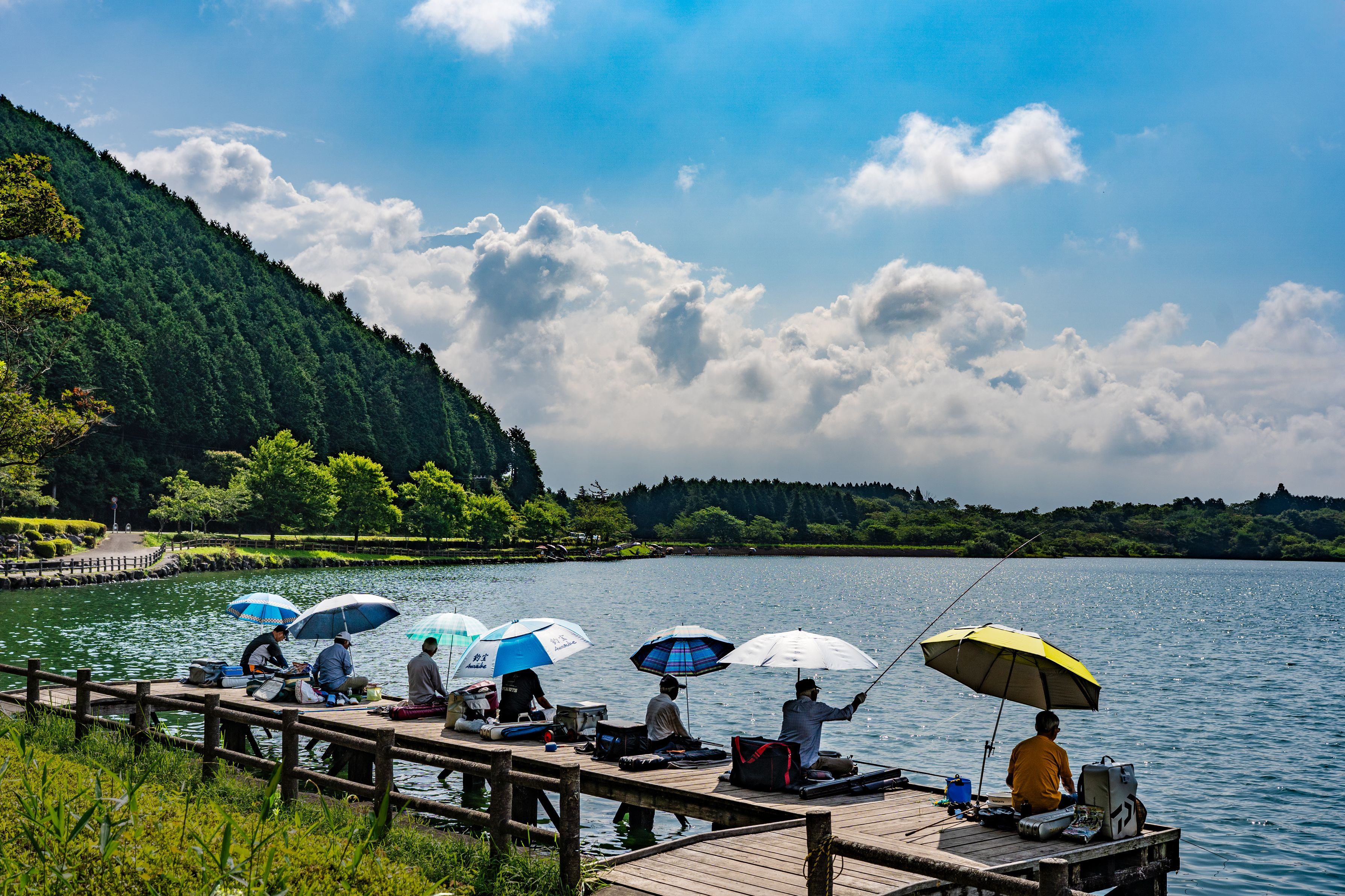田貫湖に行ったきました。残念ながら富士山は頭のてっぺんだけ。でも湖畔には釣り人達の色とりどりのパラソルが咲いていました・・