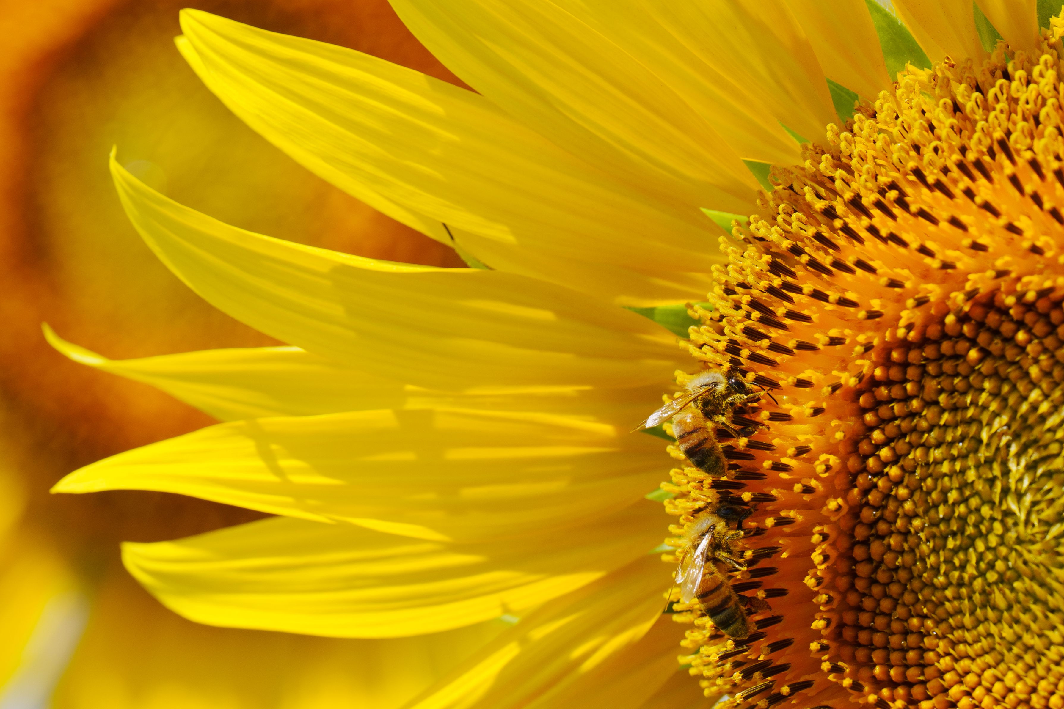 2匹のミツバチが、ひまわりの花粉(蜜も?)を一生懸命集めていました。 後ろのハチが前のハチの真似をするように同じ動きをしていたのが印象的で写真におさめてみました。