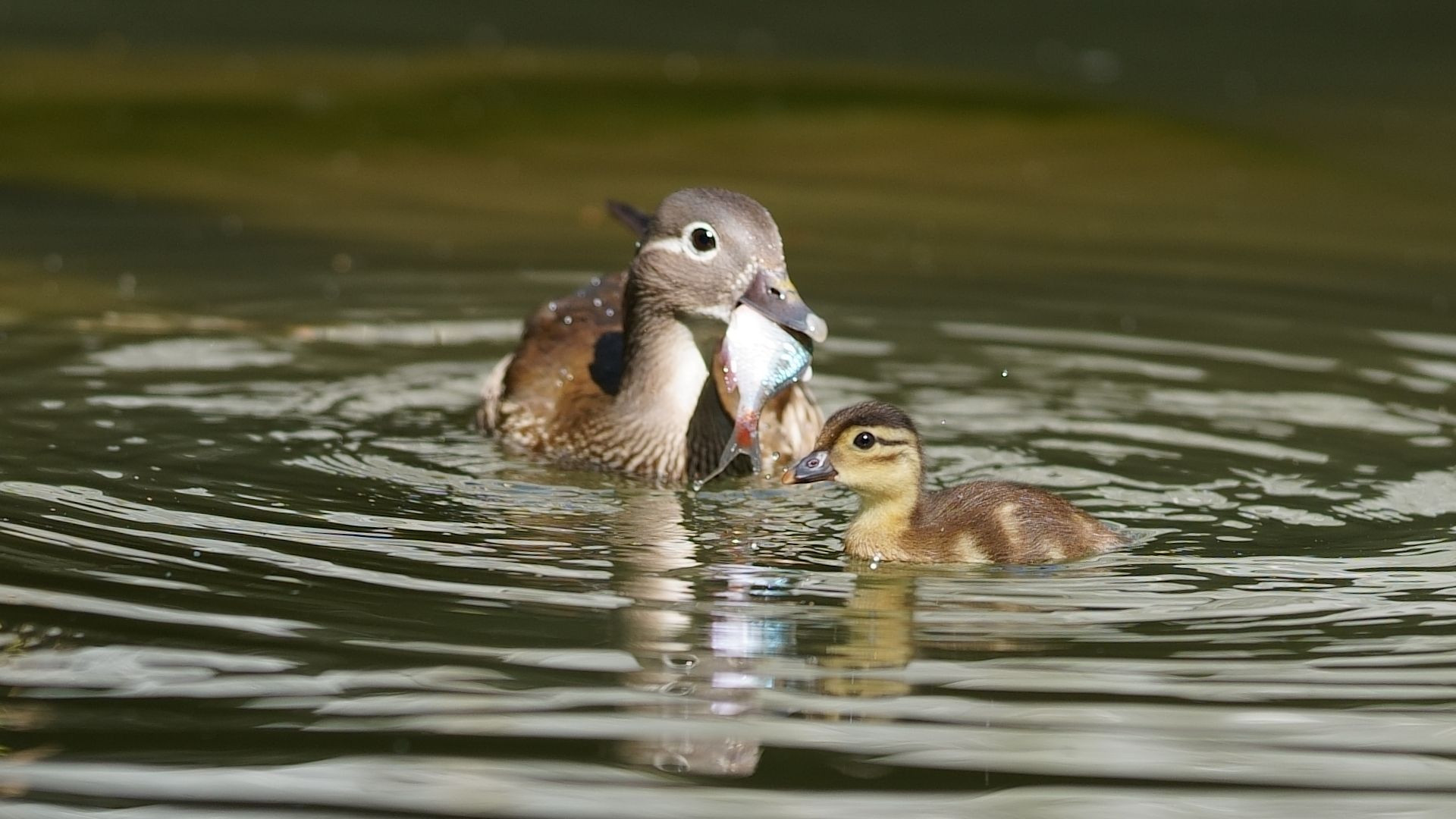 札幌市中島公園のヒナを連れたオシドリのメスが、小魚を捕まえた瞬間です。
