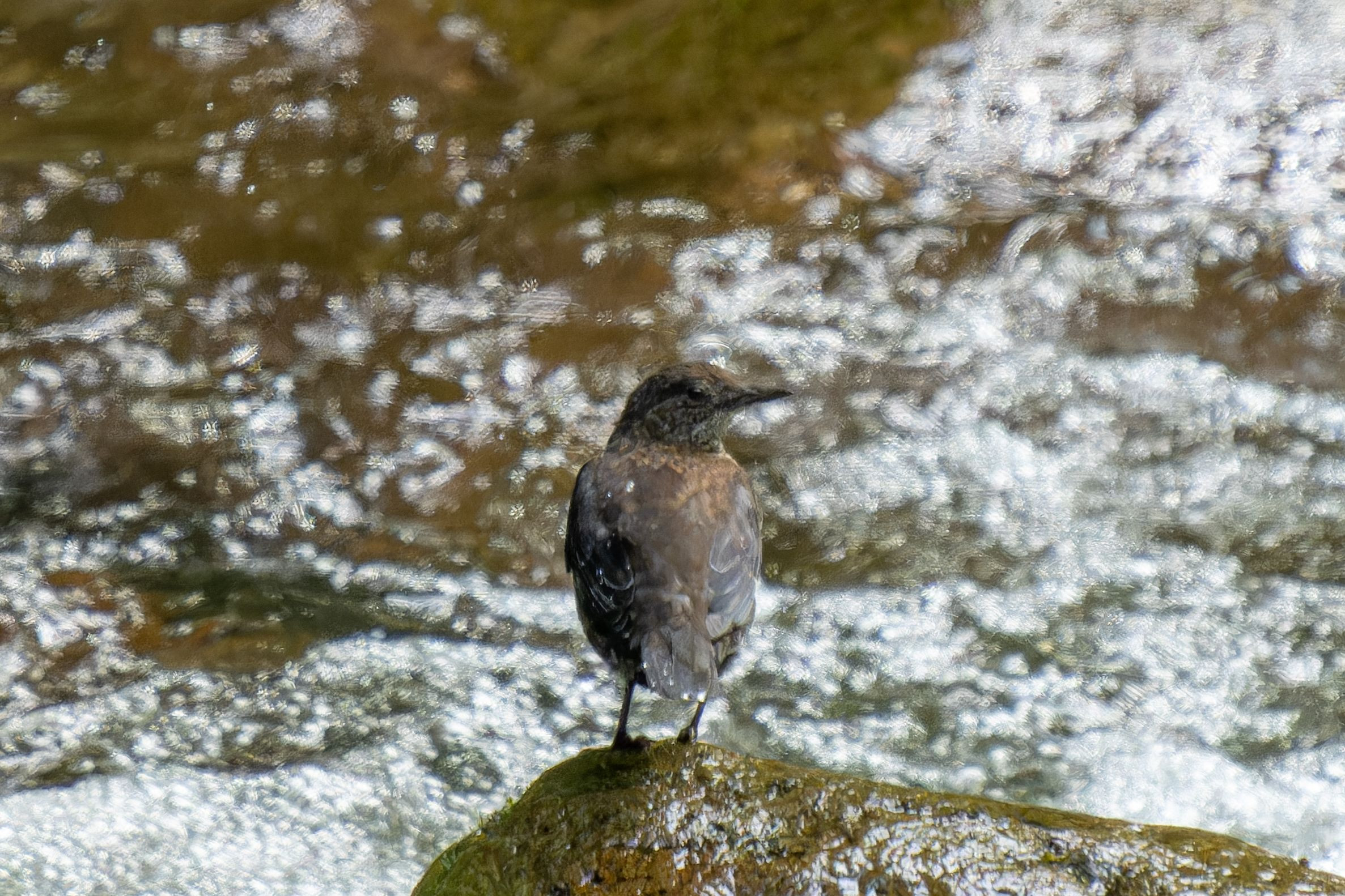 オオジシギさんに会いに遠征したのですが、管理の方に、「今は抱卵中で飛んでないよ、6月は飛んでたけど」、と言われてガックリ。 あきらめきれずに湿原を探してみましたが、いるのはモズさん、ウグイスさん、カラスさん。 でも、帰りの川沿いの道でカワガラスさんに会えました。