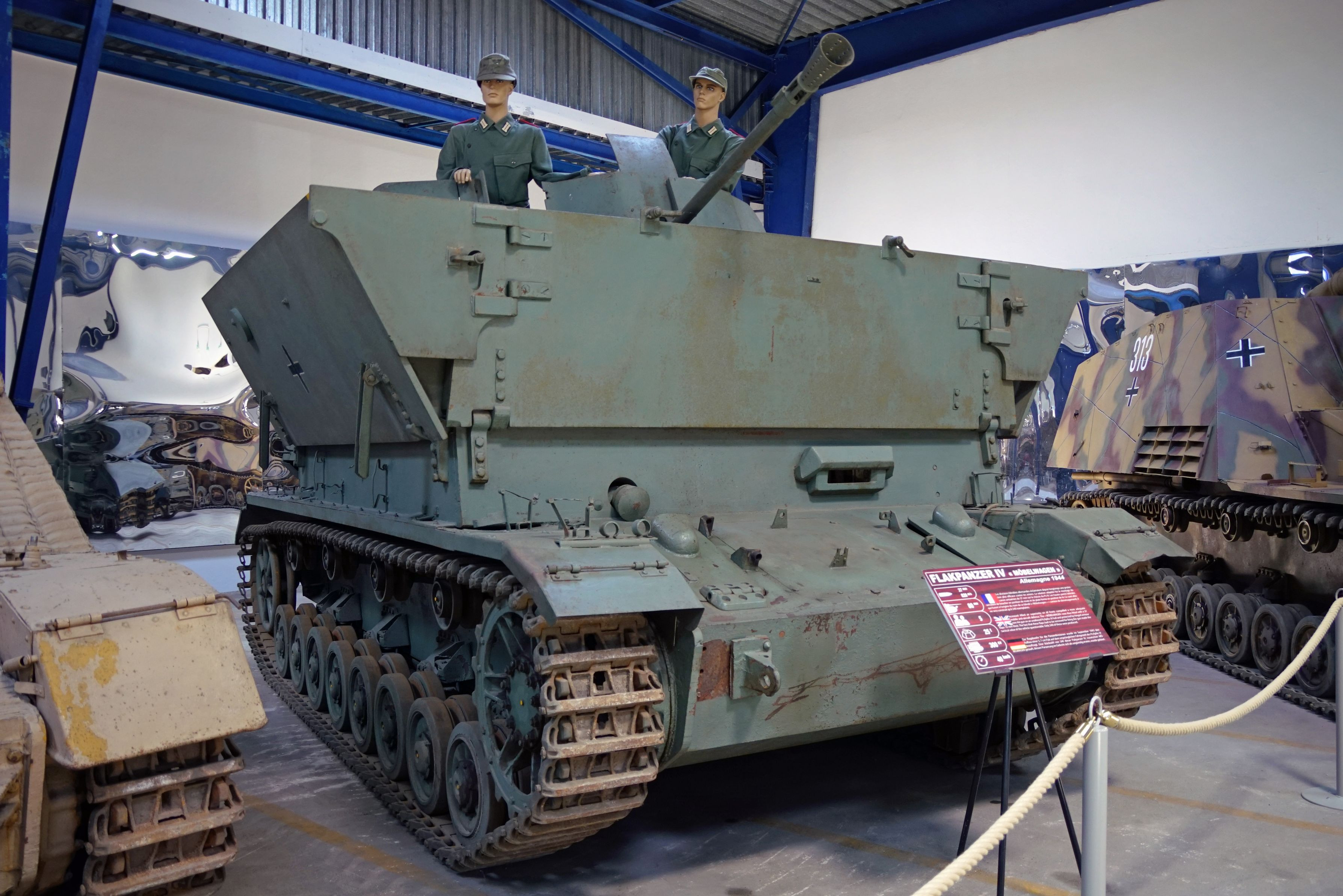形式名称通り4号戦車をベースに対空砲FlaK43/1を乗っけて製作された自走対空砲ですね。展示は側面装甲板を展開した射撃状態を示しており、上部構造物は移動中は四角く畳まれ、その雰囲気から“メーベルワーゲン=家具運搬車”とあだ名が付いたそうです♪