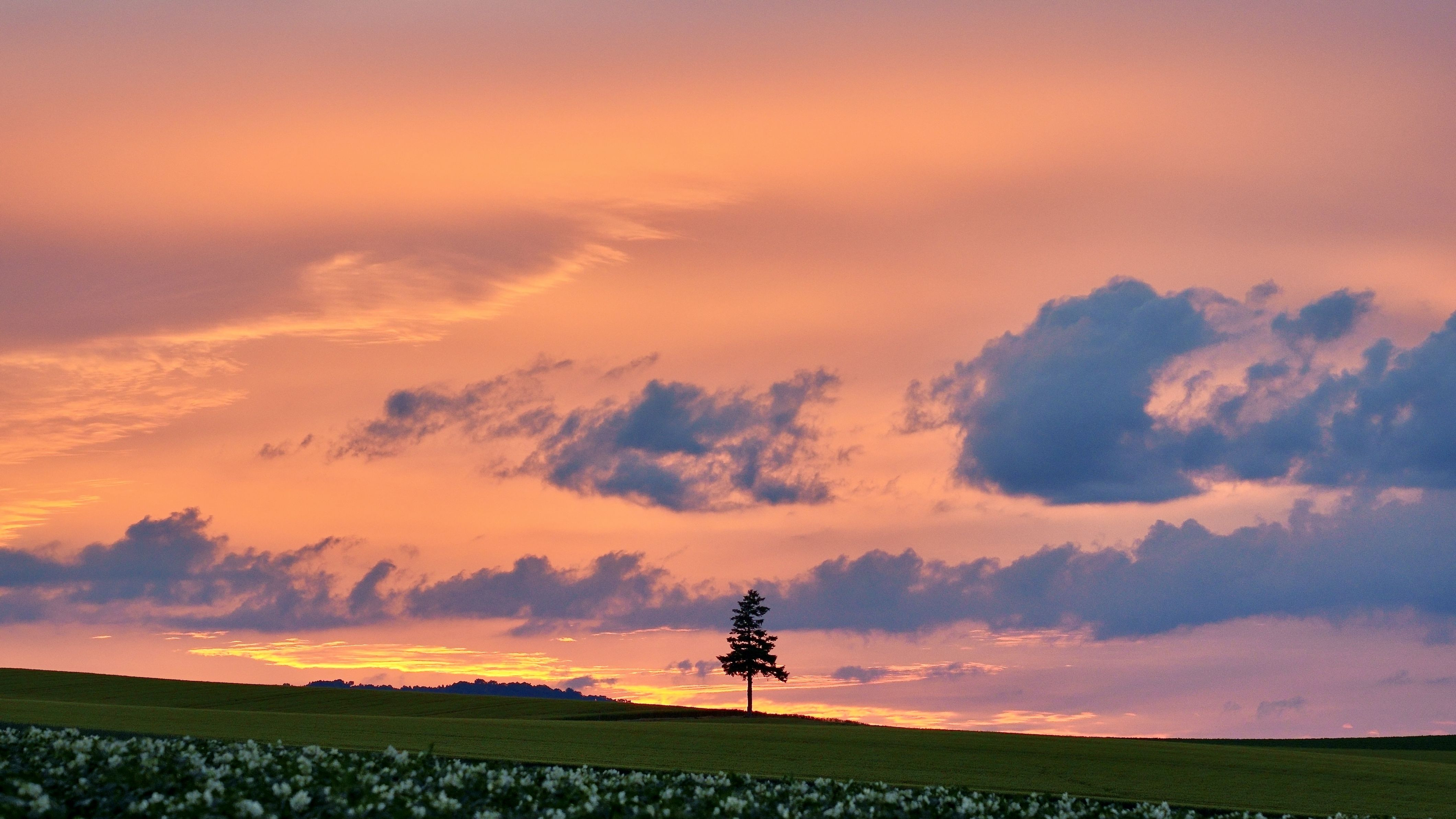 木の前の畑にはジャガイモが植えられ花が咲いていました。