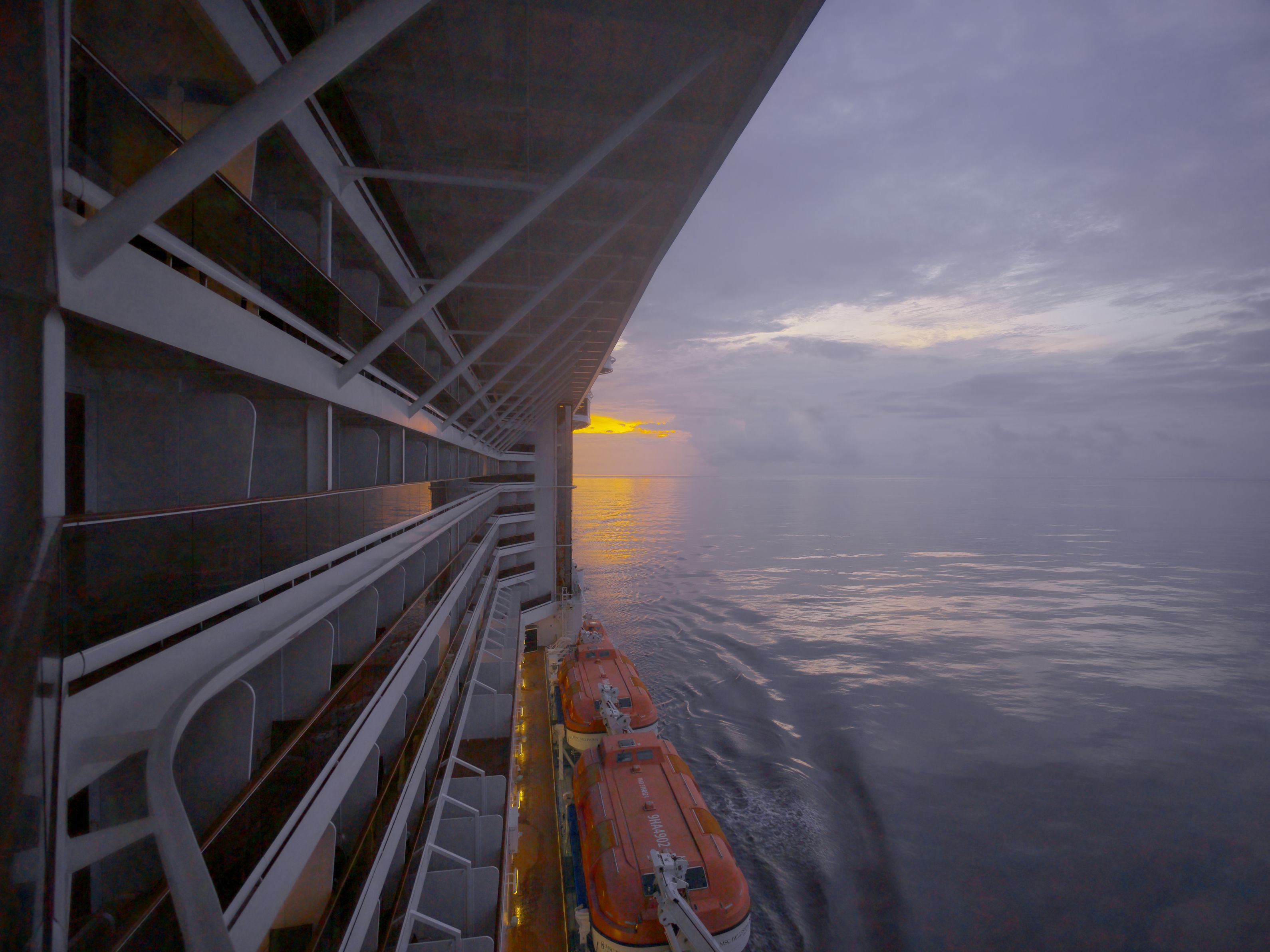 クルーズ船、MSCベリッシマの海側バルコニーの一室から撮影した朝の一枚。水面が静かで美しかった。