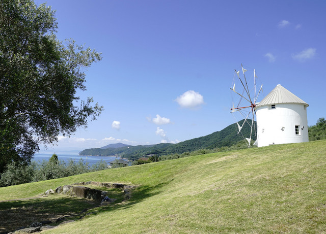 小豆島のオリーブ畑から風車が見渡す瀬戸内海